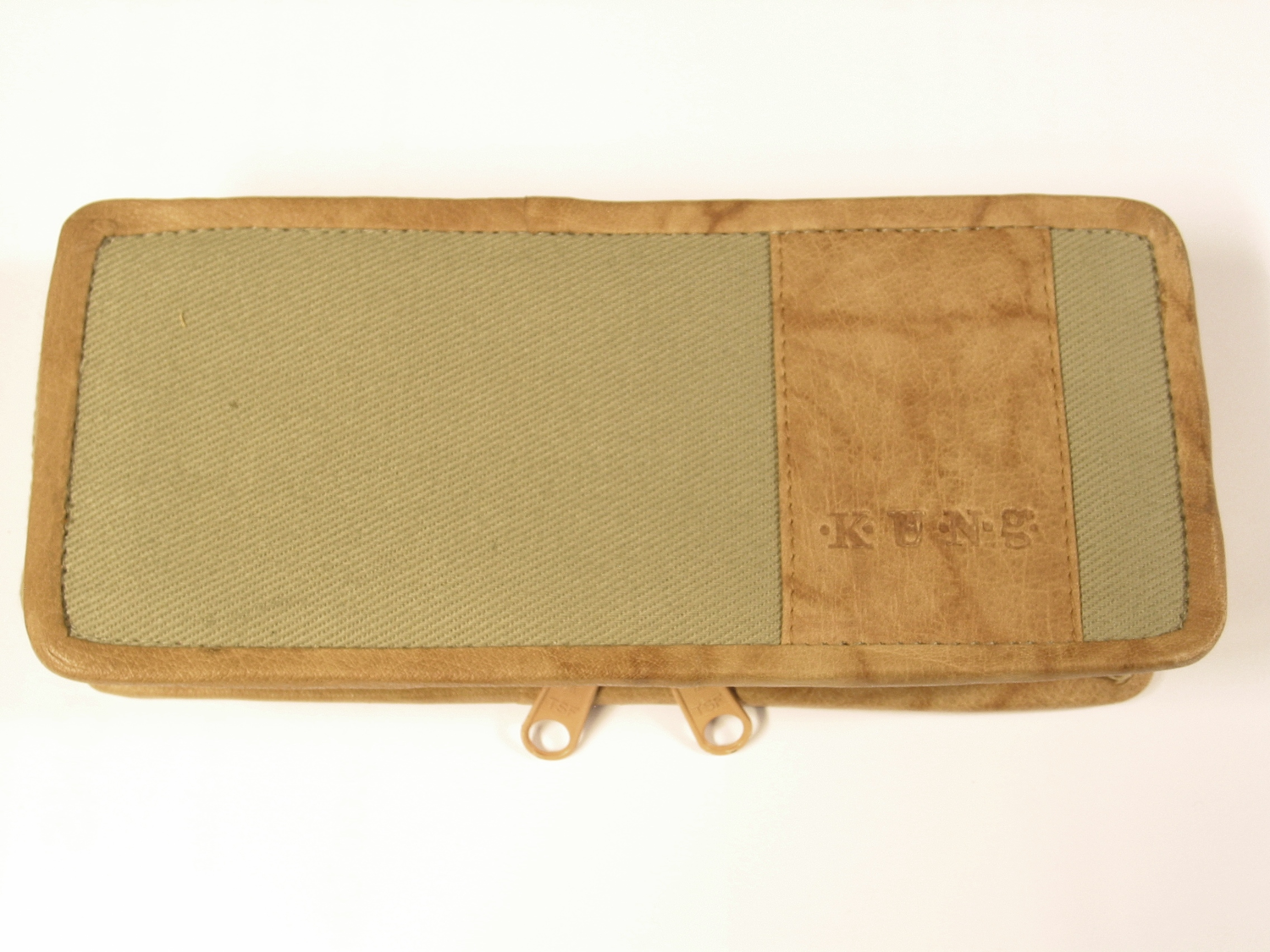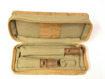 Hülle für die zweiteilige Sopraninoblockflöte mit Stoffbezug und Leder von Küng.