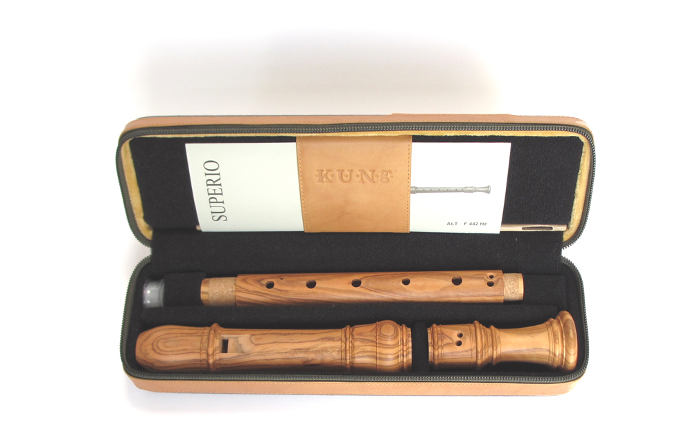Festes Etui für die dreiteilige Altblockflöte mit Stoffbezug und Leder von Küng. Die Trennwände des Etuis sind mit Klettverschluss, damit lässt sich das Etui auch für anderen Blockflöten anpassen.