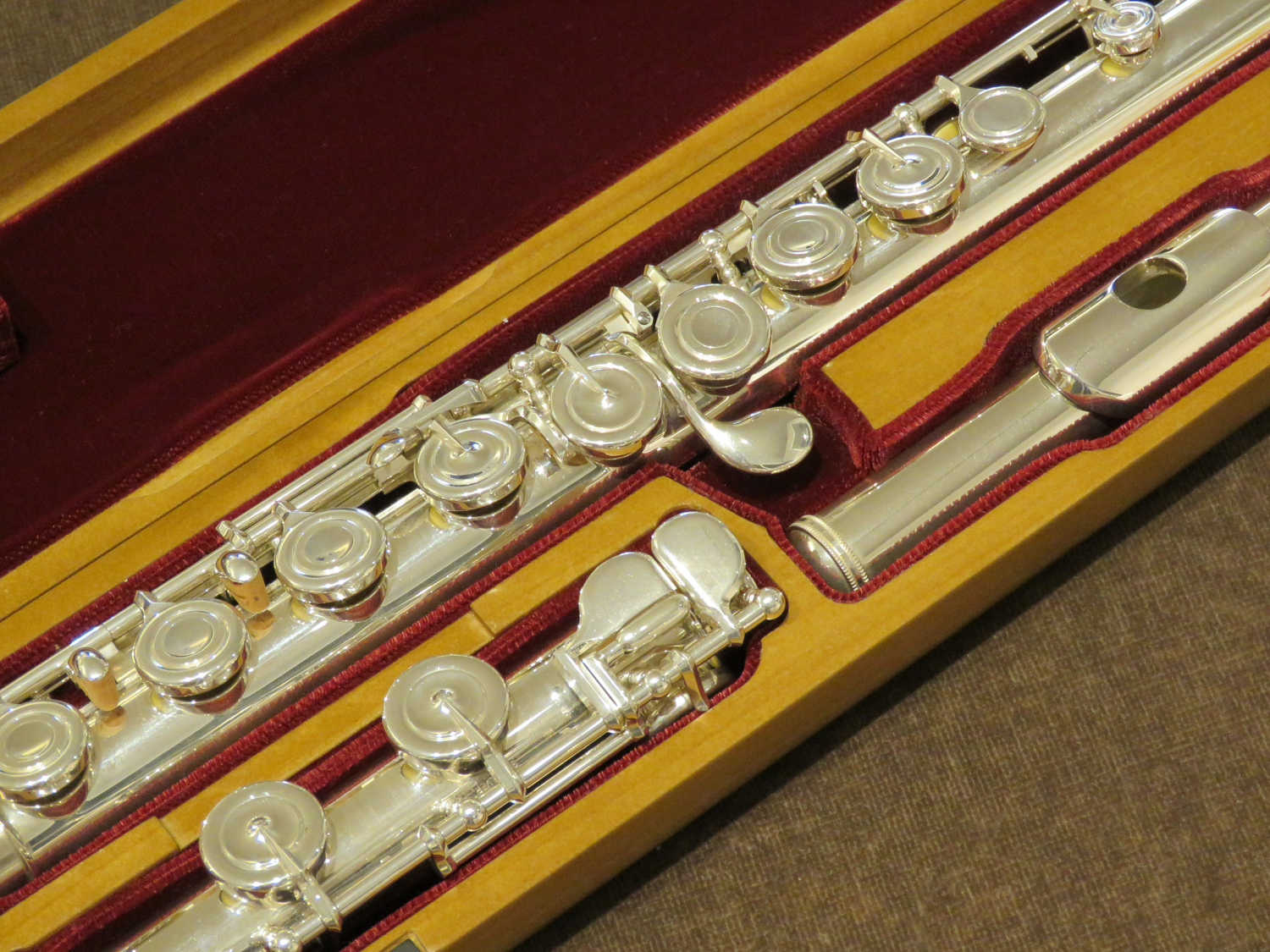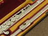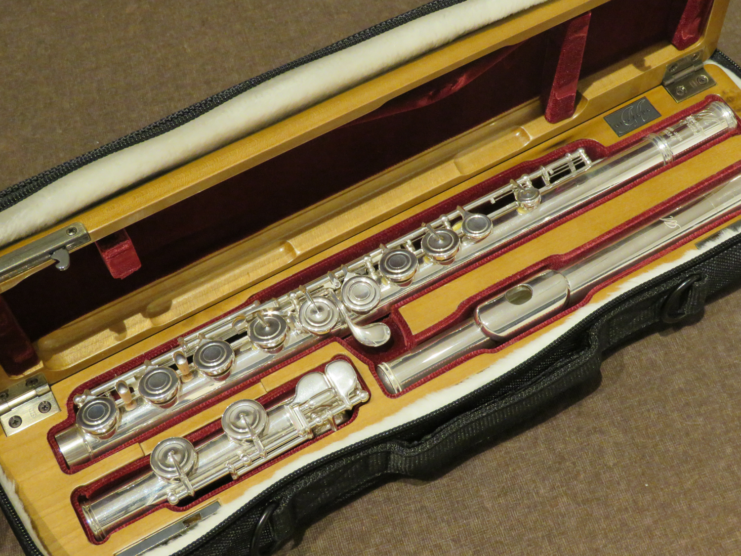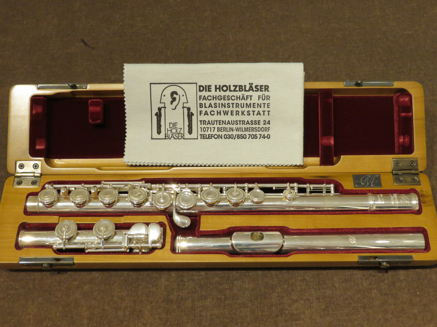 Querflöte von Miyazawa Modell PB-925-1-RE, Kopfstück, Korpus und Mechanik aus 925er Sterlingsilber, Kamin aus 990er. Ausstattung: Ringklappen, C-Fuß, E-Mechanik, vorgezogenes G, Spitzdeckelmechanik und "Partial-Brögger-System", sehr guter Zustand