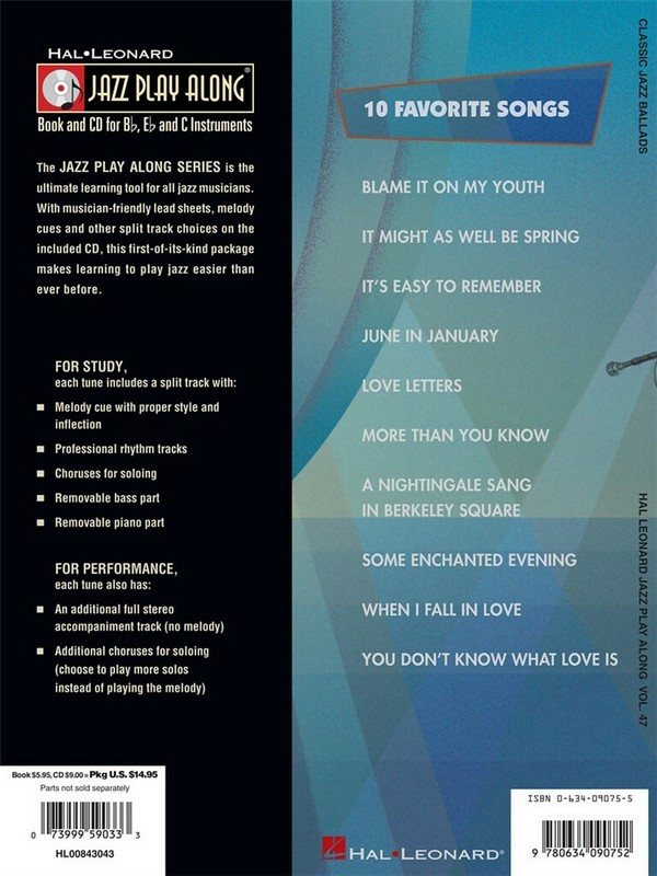 | Jazz play along vol.47 Blame it on my youth It might as well be spring It's easy to remember June in January Love letters More than you know A nightingale sang in Berkeley Square Some enchanted evening When I fall in love You don't know what love is | |