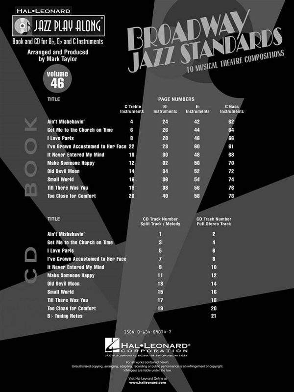 | Jazz Playalong vol.46 Ain't Misbehavin' Get Me To The Church On Time I Love Paris It Never Entered My Mind I've Grown Accustomed To Her Face Make Someone Happy Old Devil Moon Small World Till There Was You Too Close For Comfort | |