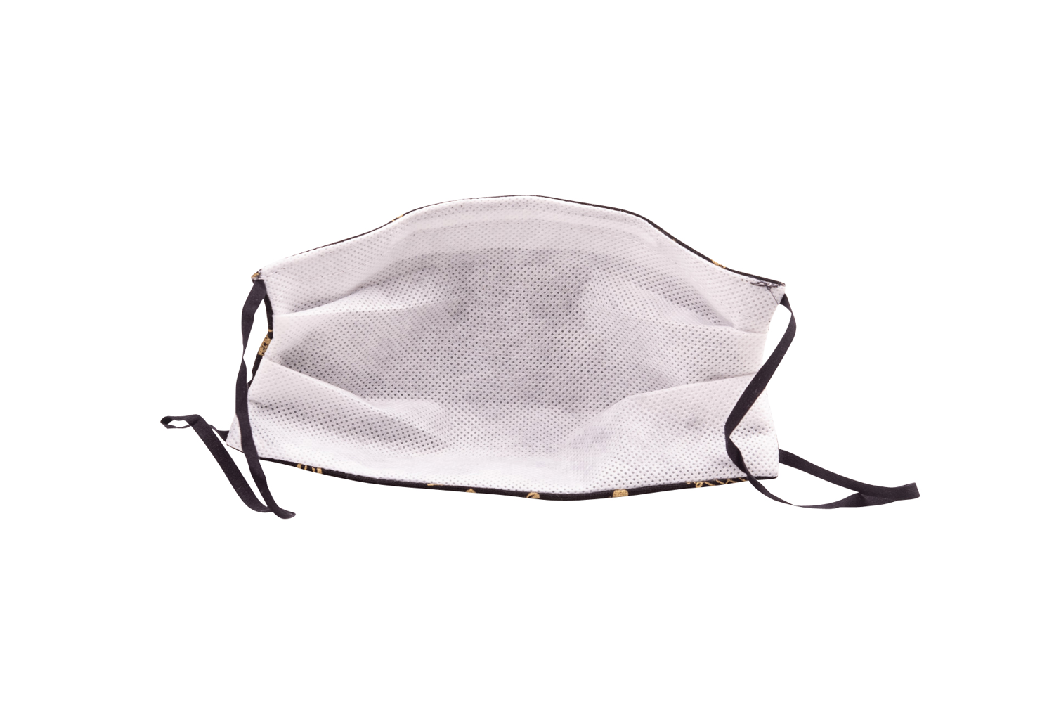 schwarze Textilmaske aus Baumwolle, mit Innenvlies aus hydrophobem (wasserundurchlässig) Material von Beiersdorf