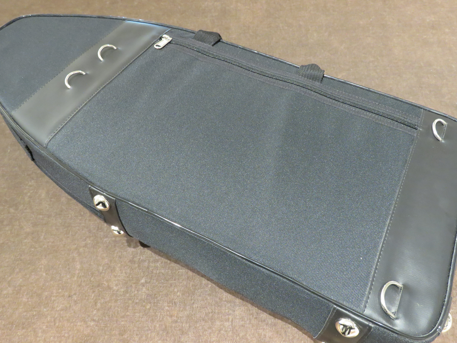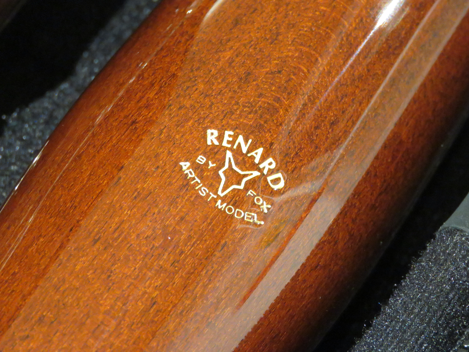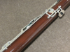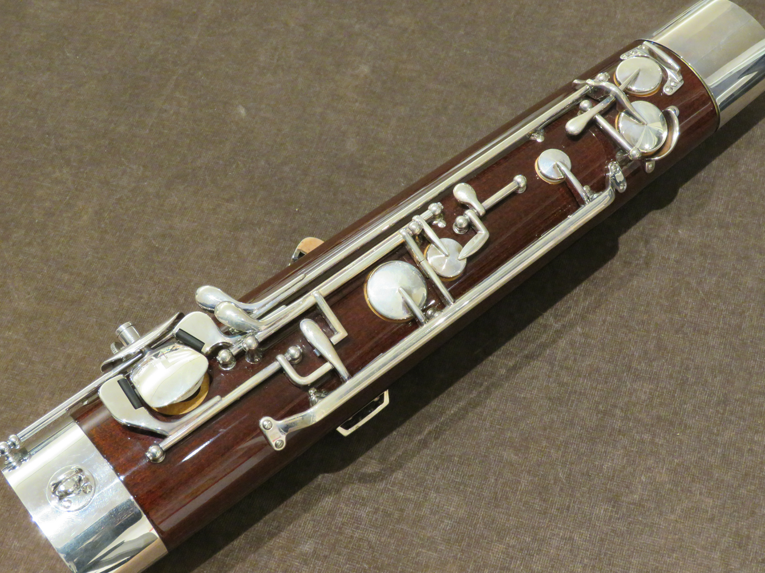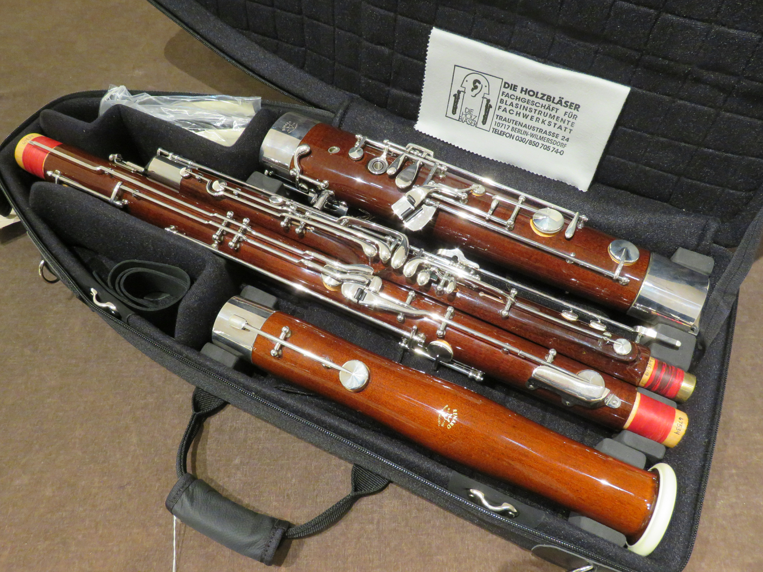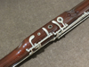 Korpus aus Zucker- oder Rotahorn mit speziellem Politurlack, Neusilbermechanik versilbert, 25 Klappen, hoch D-Klappe, hoch E-Klappe, Dauerschließer für Pianomechanik, große C-Griffplatte an Baßstange, 2 S-Bögen, Etui und Zubehör.