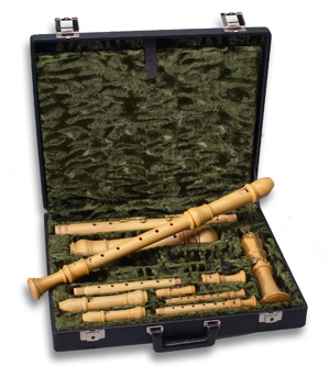 Blockflötenetui aus Holz mit Kunstlederüberzug und gefüttertem Formbett aus grünem Samt, für Sopranino-, Sopran,- Alt-, und Tenor-, und Bassblockflöte.
