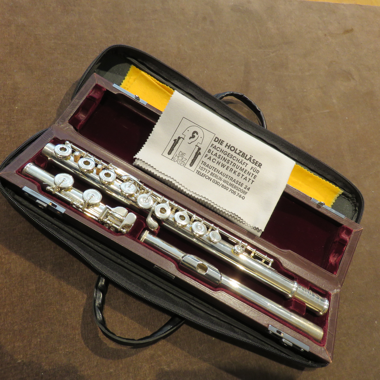 Vollsilberflöte mit Ringklappen, H-Fuß, E-Mechanik, vorgezogenes G, gezogene Tonlochkamine, normale Wandstärke