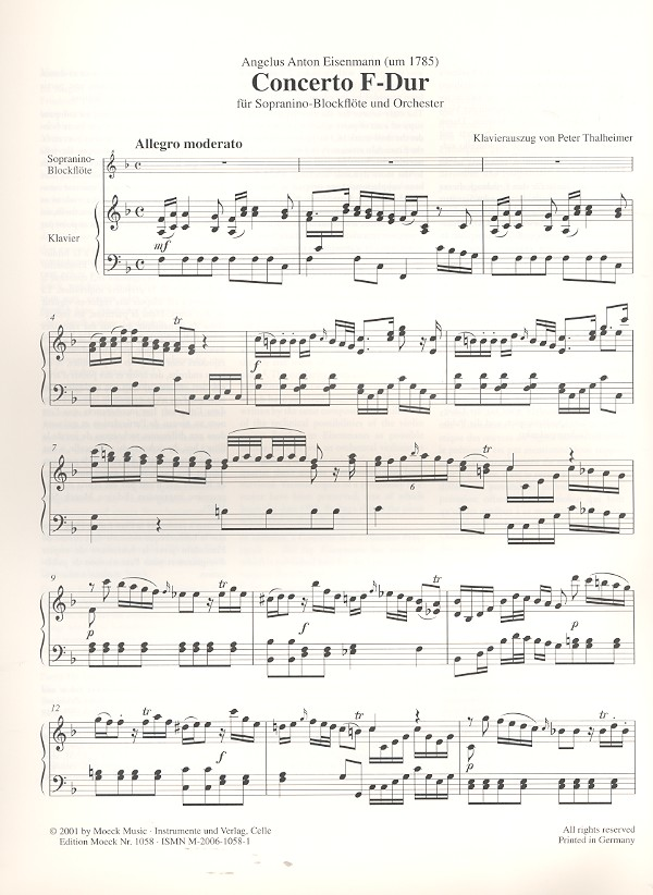 | Concerto F-Dur für Sopraninoblock- flöte und Orchester Klavierauszug und Solostimme | |
