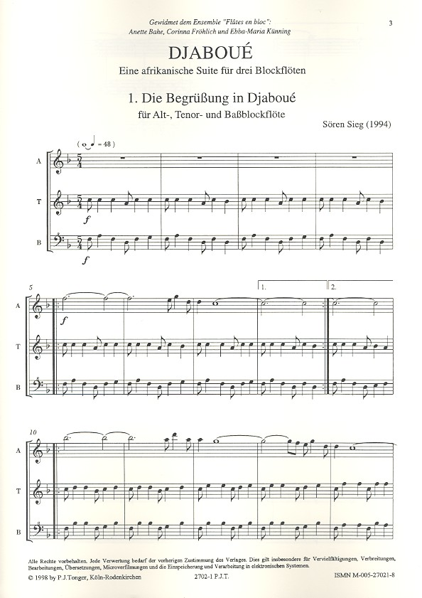 | Djaboue Afrikanische Suite für 3 alternierende Blockflöten (ATB/SAT/ATB) Partitur und Stimmen | |
