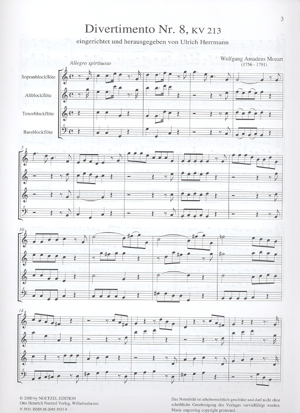 | Divertimento Nr.8 KV213 für 4 Blockflöten (SATB) Partitur und Stimmen | |