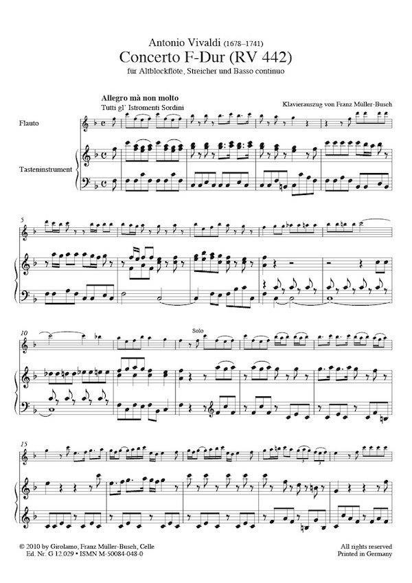 | Konzert F-Dur RV442 für Altblockflöte, Streicher und Bc für Altblockflöte und Klavier | |
