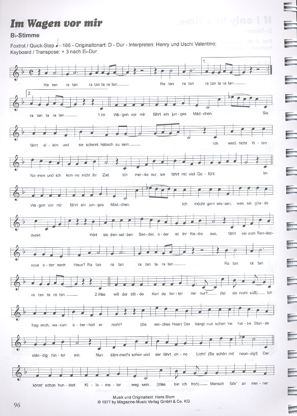 | Die schönsten Evergreens, Schlager, Oldies zweistimmig leicht sing- und spielbar gesetzt für Saxofon, Trompete, Klarinette, angelehnt an das Buch 100 Hits in C-Dur In diesem Spielbuch sind die gleichen Songs enthalten wie in 100 Hits in C-Dur BOE7696, und diese sind hier jeweils in Bb- & Eb-Dur gesetzt und mit den Texten versehen. Beide Bücher können als gegenseitige Ergänzung verwendet werden. Aber bitte mit Sahne Aber dich gibt's nur einmal für mich Ade zur guten Nacht Aloha-oe An der Nordseeküste Anton aus Tirol Are you lonesome tonight Auf Wiedersehn Capri-Fischer Chianti-Lied Country Roads Das Schweizermadel Der letzte Walzer mit dir Der wilde wilde Westen Diana Die Fischer von San Juan Die Hände zum Himmel Down by the Riverside El lute Es gibt kein Bier auf Hawaii Es hängt ein Pferdehalfter an der Wand Eviva espana Fiesta Mexicana Guantanamera Gute Nacht Freunde Happy Birthday to you Heißer Sand Hello again Hello Mary Lou Herz-Schmerz- Polka Hey Baby Hoch auf dem gelben Wagen Hohe Tannen Horch was kommt von draußen rein If i only had Time Im Wagen vor mir In Junkers Kneipe In München steht ein Hofbräuhaus It's now or never Ja mir san mitm Radl da Jamaica Farewell Jenseits des Tales Junge komm bald wieder Komm gibt mir deine Hand Kufsteiner Lied La Montanara La Paloma Let it be Liebeskummer lohnt sich nicht Lili ,arleen Logo logo Mademoiselle Ninette Marina Marmor Stein und Eisen bricht Massachusetts Mexican Girl Michaela Mit 17 fängt das Leben erst an Mit 66 Jahren Morning has broken Mull of Kintyre Ob-la-di Oh my Darling Caroline Oh when the Saints Polonaese Blankenese Proud Mary Ramona Rennsteiglied Ring of Fire Rote Lippen soll man küssen Sailing Santo Domingo Schneewalzer Schön ist die Liebe im Hafen Schürzenjägerzeit See you later Alligator Seemann deine Heimat Shananana Sloop John B So ein Tag Sommer in der Stadt Spaniens Gitarren Sugar Baby Take it easy altes Haus The last Farewell The spanish Night is over This Land is your Land Tief im Böhmerwald Tulpen aus Amsterdam Über den Wolken Unten im Tale Va bene Verlieben verlorn vergessen Wahnsinn Was kann schöner sein Weisse Rosen aus Athen Wenn es dich noch gibt Wenn wir erklimmen Wenn wenn du sagst Wo die Nordseewellen in Zusammenarbeit mit dem Verlag Hildner BESHITS 100-016-4 9783932839283 angelehnt an die C-Dur-Ausgabe Evergreens, Schlager, Oldies | |