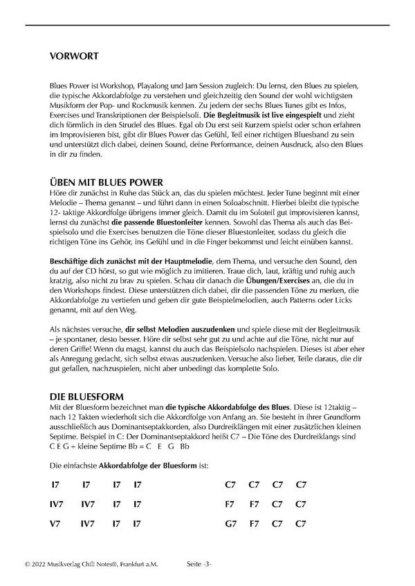 | Blues Power ist Workshop, Playalong und Jam Session zugleich: Du lernst, den Blues zu spielen, die typische Akkordabfolge zu verstehen und gleichzeitig den Sound der wohl wichtigsten Musikform der Pop- und Rockmusik kennen. Zu jedem der sechs Blues Tunes gibt es Infos, Exercises und Transkriptionen der Beispielsoli. Die Begleitmusik ist live eingespielt und zieht dich förmlich in den Strudel des Blues. Egal ob Du erst seit Kurzem spielst oder schon erfahren im Improvisieren bist, gibt dir Blues Power das Gefühl, Teil einer richtigen Bluesband zu sein und unterstützt dich dabei, deinen Sound, deine Performance, deinen Ausdruck, also den Blues in dir zu finden. Die zweite Auflage enthält neu eingespielte Soli und für jeden Titel ein komplettes Workout, das dich fit für den Blues macht! | |