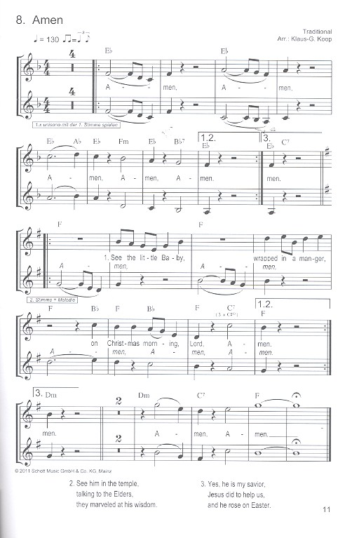 | Magolt, Hans und Marianne, arr. Go down Moses Joshua fit the Battle of Jericho When the Saints go marching in He's got the whole World in his Hands Gimme that old Time Religion Go tell it on the Mountain Michael row the Boat ashore Amen Swing low sweet Chariot Rock my Soul Nobody knows the Trouble I've seen Sometimes I feel like a motherless Child Down by the Riverside Oh happy Day The Gospel Train Deep River This Train is bound for Glory Over in the Gloryland Didn't it rain Wade in the Water | |