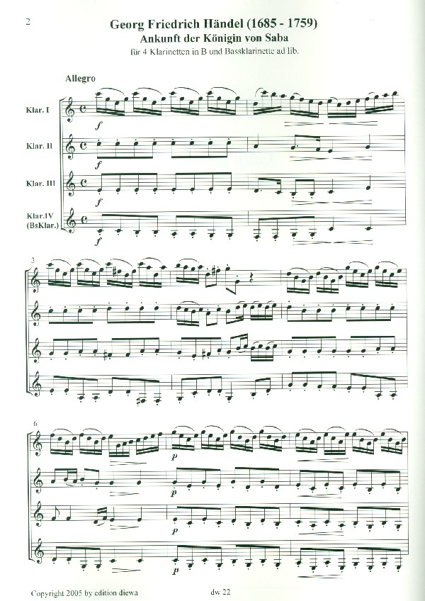 | Ankunft der Königin von Saba für 4 Klarinetten (Bassklarinette ad lib) Partitur und Stimmen | |