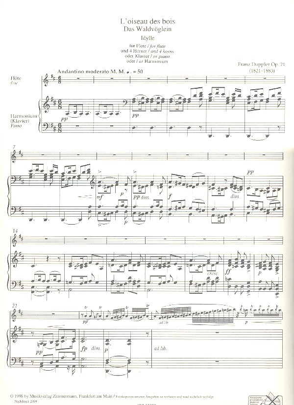 | Das Waldvöglein op.21 Idylle für Flöte und 4 Hörner (Flöte und Klavier / Harmonium) 6 Stimmen | |