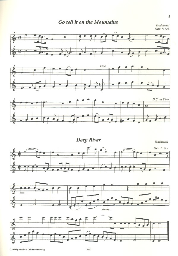 | Schmitt, Paul, arr Go tell it on the Mountains Deep River Joshua fit the Battle of Jericho Oh Freedom Down by the Riverside Swing low sweet Chariot Nobody knows the Trouble I've seen They crucified My Lord By amd by Amazing Gracie Oh Mary don't you weep Were you there Kumbayah my Lord Standin's in the Need of Prayer Sometimes I feel like a motherless Child Whisper a Prayer Climb up Children He's got the whole World in His Hand The Heaven is shining full of Love Go down Moses | |