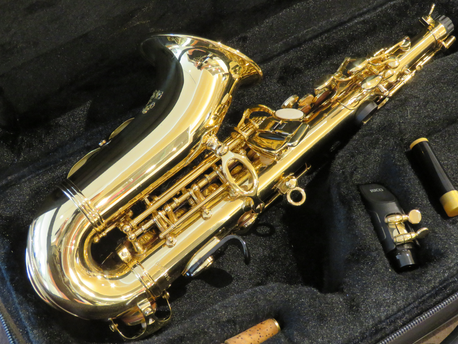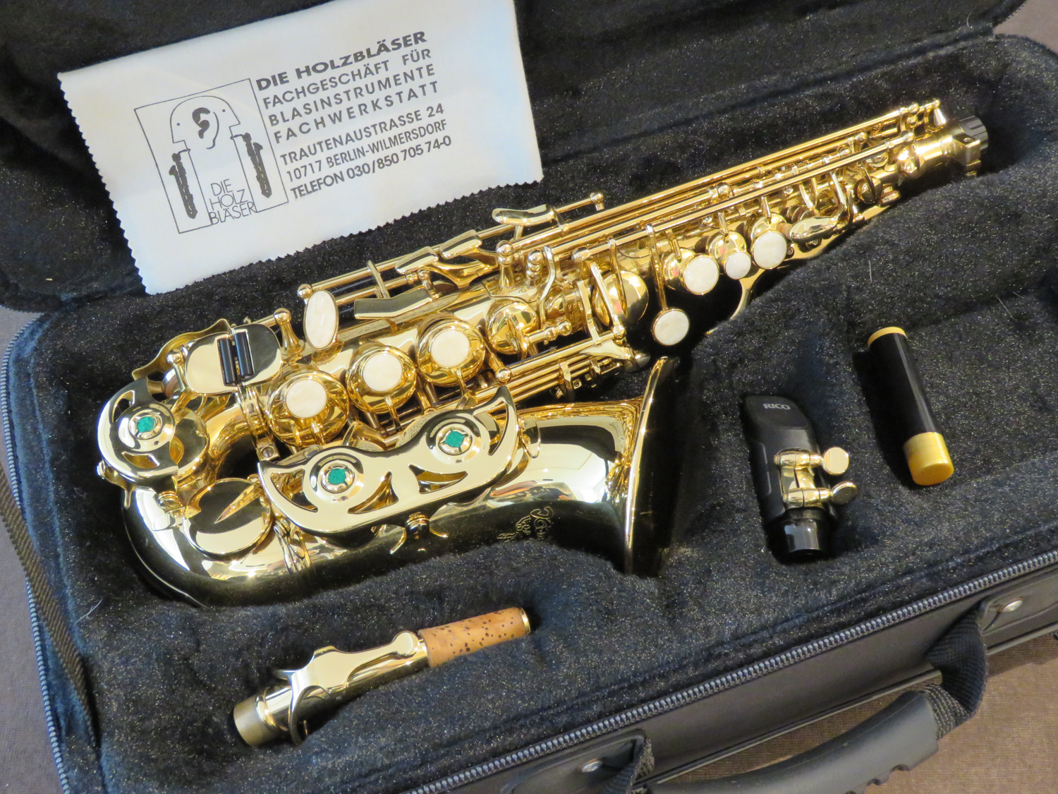 gebogenes Sopransaxophon, Goldlack, aus der Vermietung, mit wenigen Gebrauchsspuren, in sehr gutem Zustand, inkl. Mundstück und Gurt, für Kinder geeignet, im Etui mit Zubehör