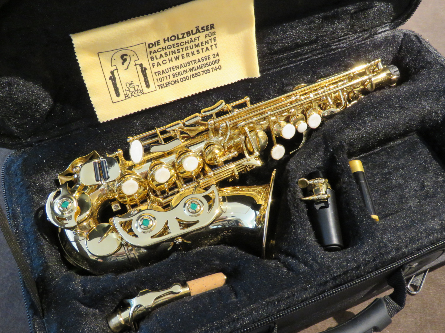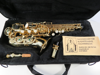 gebogenes Sopransaxophon, Goldlack, aus der Vermietung, mit Gebrauchsspuren, in gutem Zustand, inkl. Mundstück und Gurt für Kinder geeignet, im Etui mit Zubehör