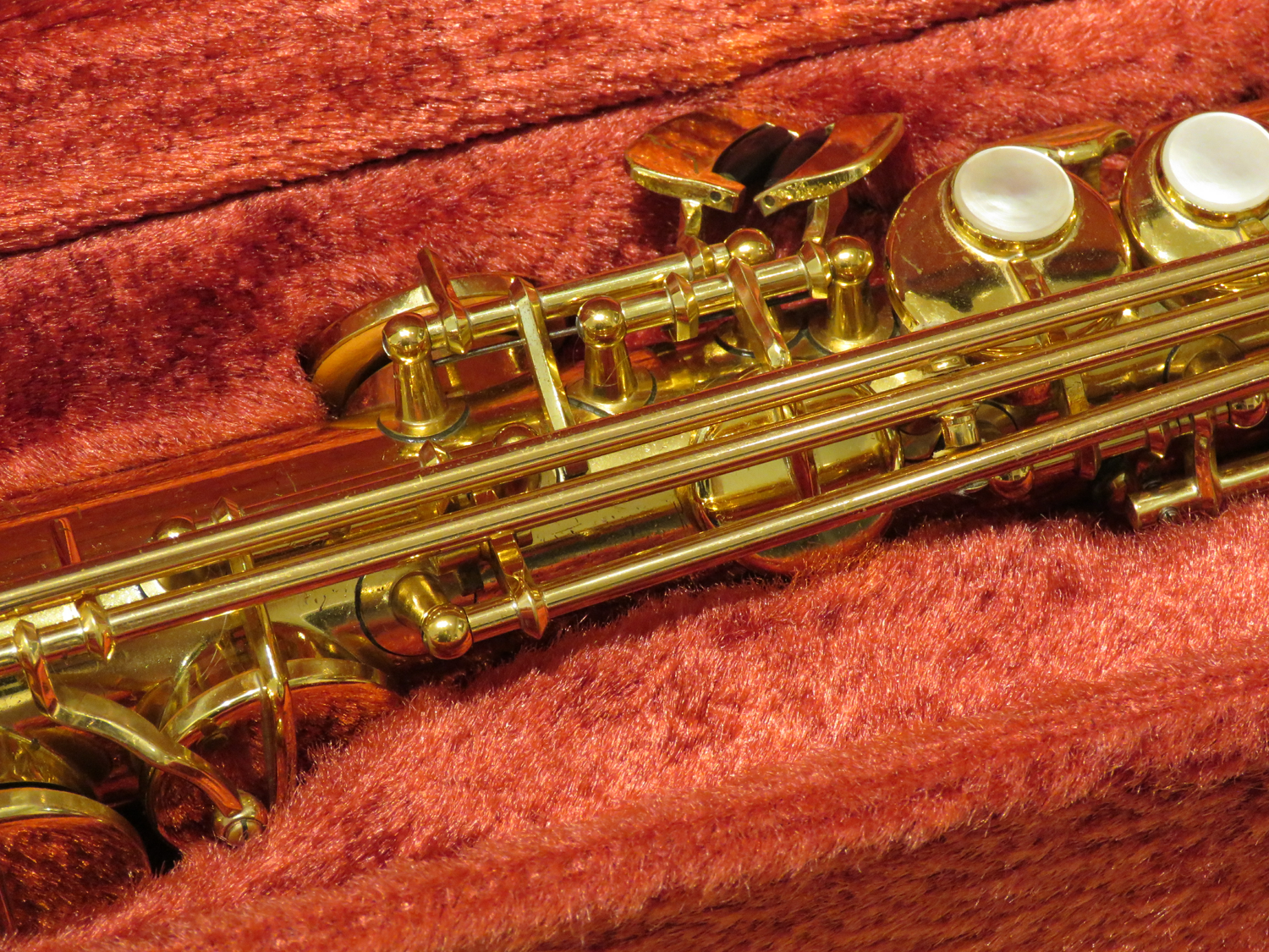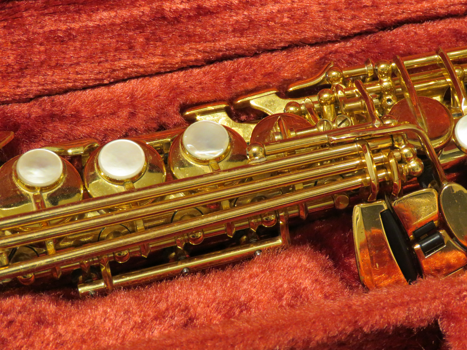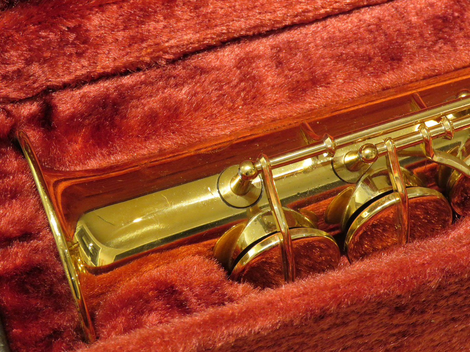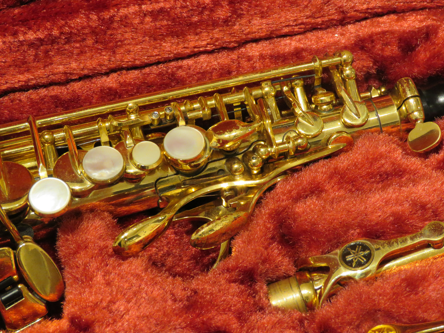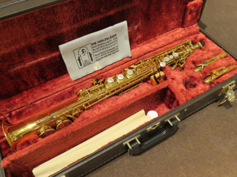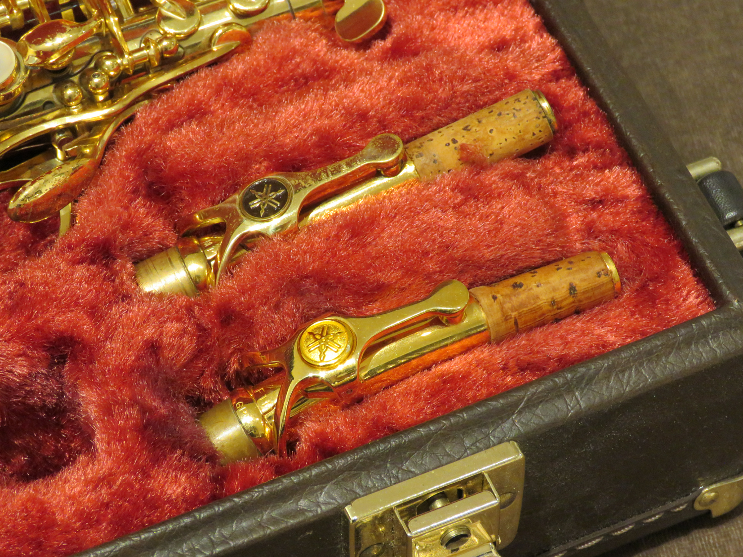 Sopransaxophon Yamaha 675, Baujahr ca. 1999, gerader Bogen Modell "M1", gebogener Bogen Modell "F1R GP" (vergoldet), neue Polster, sehr guter Zustand, im Originalkoffer, gebraucht.