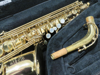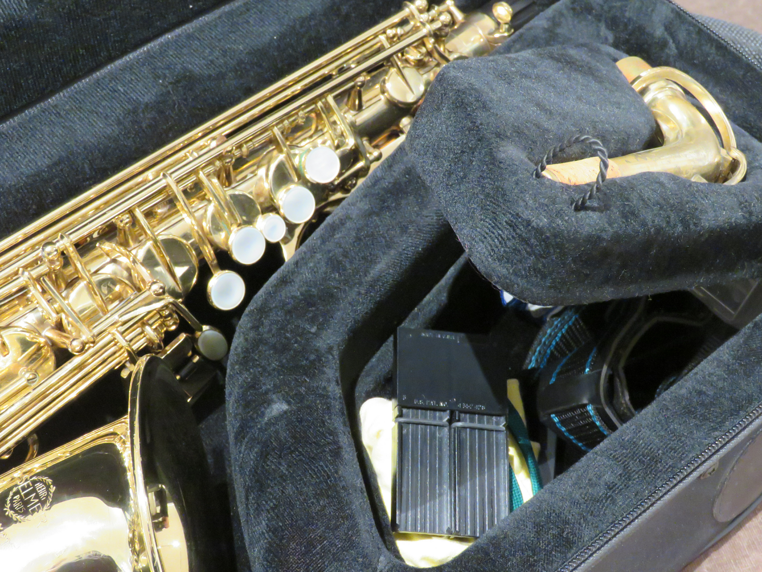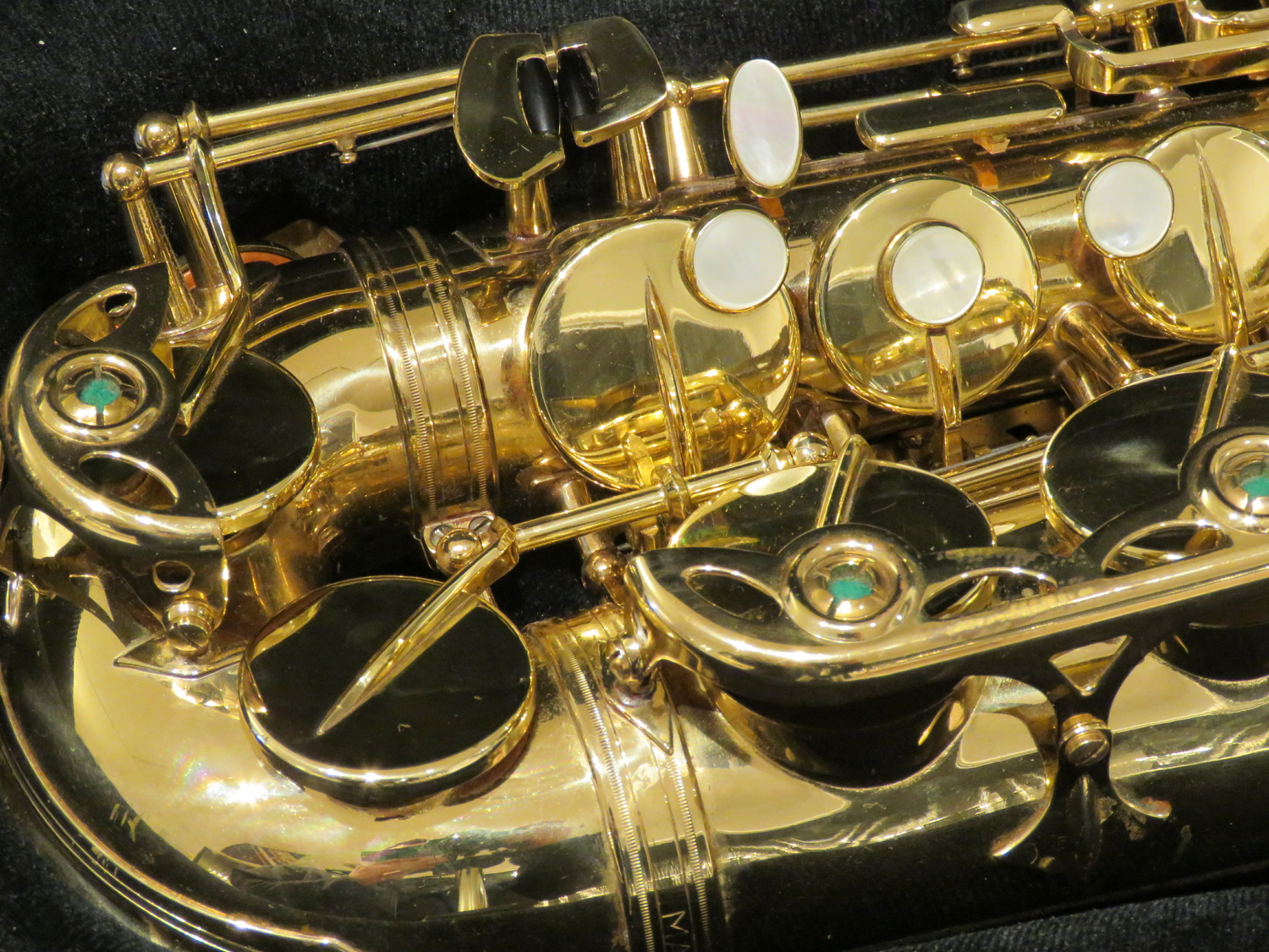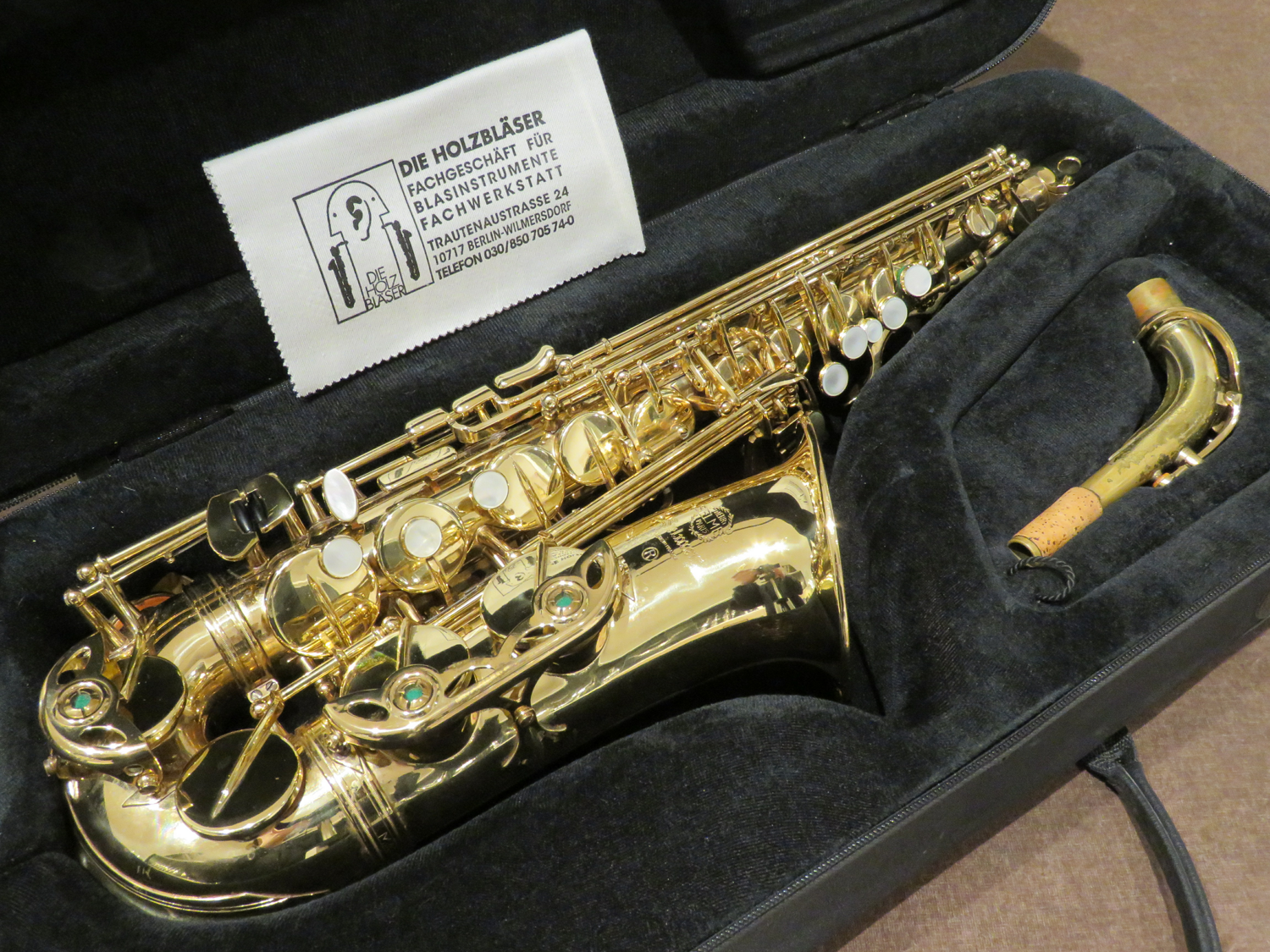 Professionelles Altsaxophon von SELMER/Paris, Serie Mark VII, klanglich gleich dem legendären Mark VI, mechanisch etwas großflächiger gebaut. Das Instrument ist in gut spielbarem Zustand, jedoch nicht überholt. Komplett mit Formkoffer.