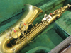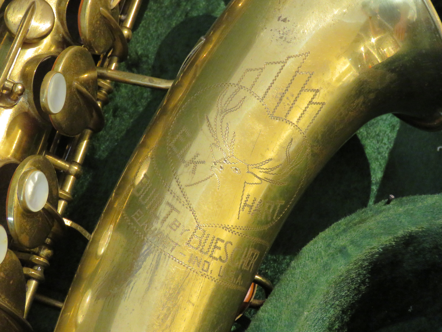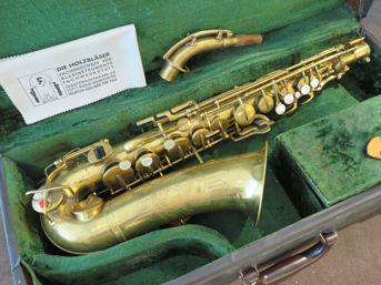 Elkhart - Ind. U.S.A. built by Buescher (Buescher Stencil), ohne Lack, Baujahr ca. 1950er Jahre, komplett neue Polster, geflickter S-Bogen (ehemals Tonabnehmer), im Holzkoffer, Verkauf im Kundenauftrag.