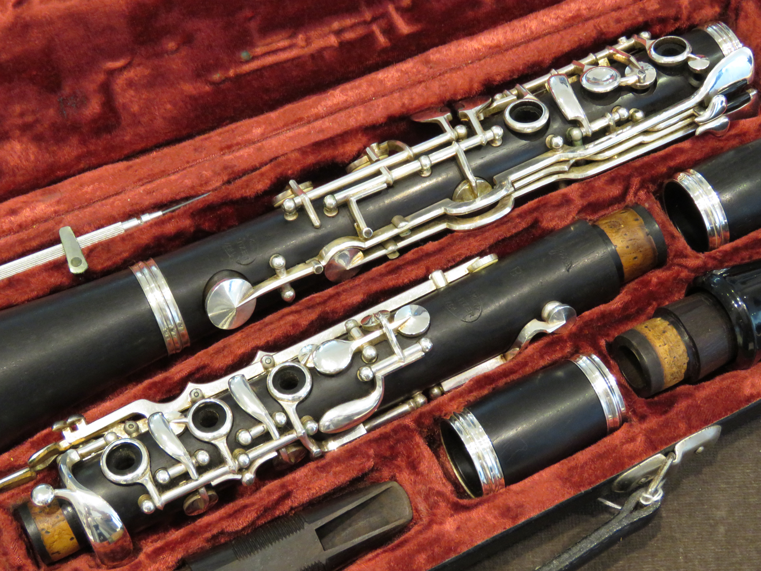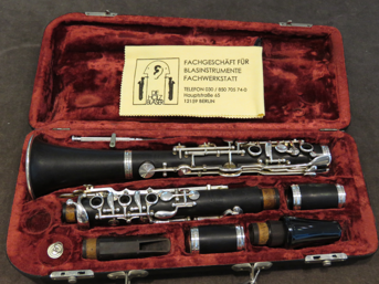 Klarinette mit Voll-Oehler Mechanik (ohne tief E/F- Verbesserung), Grenadilholz mit versilberter Mechanik, mit zwei Birnen und Mundstüch im Formkoffer, Holz-und Mechanikzustand von guter Substanz, Instrument ist noch spielbar aber überholungsbedürftig.