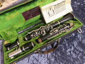 Kunststoff, 17 Klappen, 4 Ringe, 3 Triller, vernickelte Mechanik, 2 Birnen mit Mundstück im Etui. Instrument ist nicht in spielbarem Zustand, überholungsbedürftig. Instrument in hoher Stimmung.