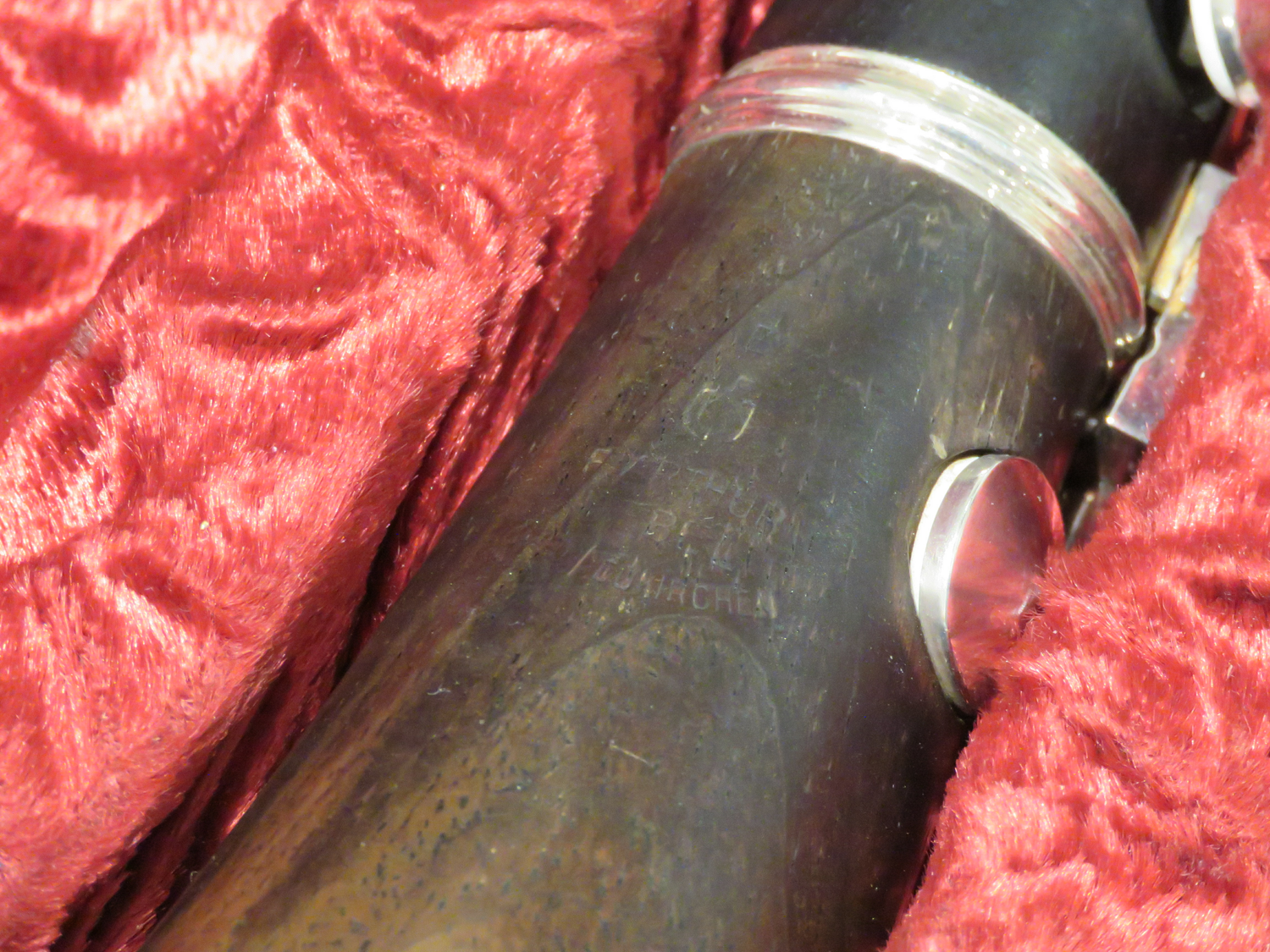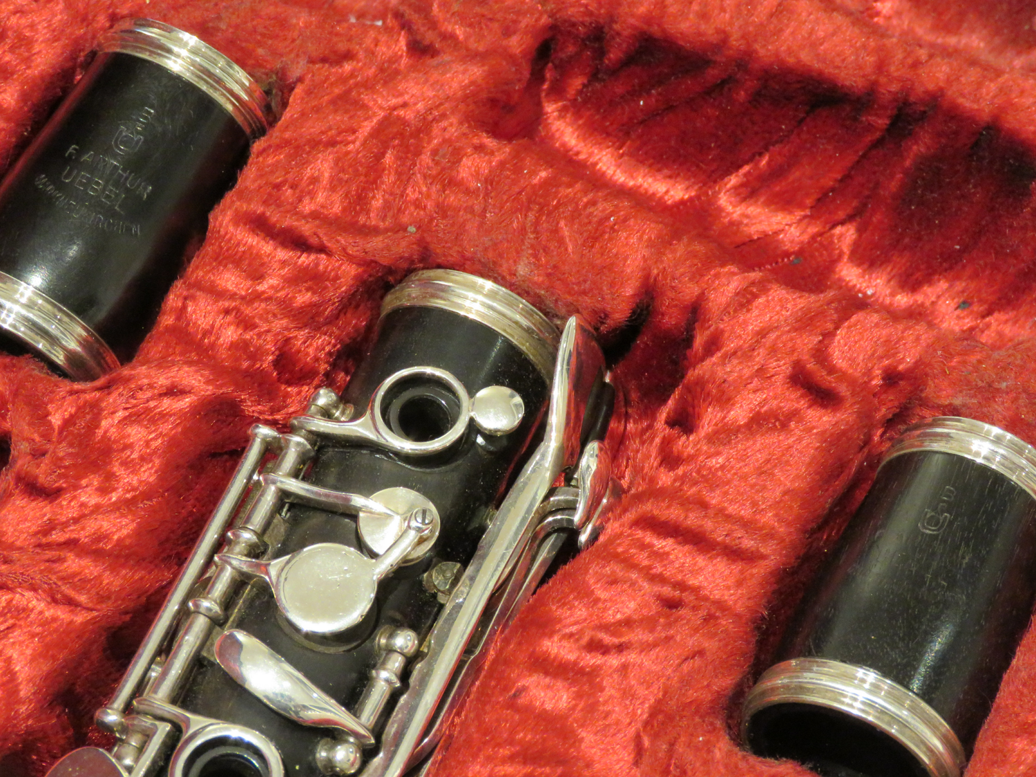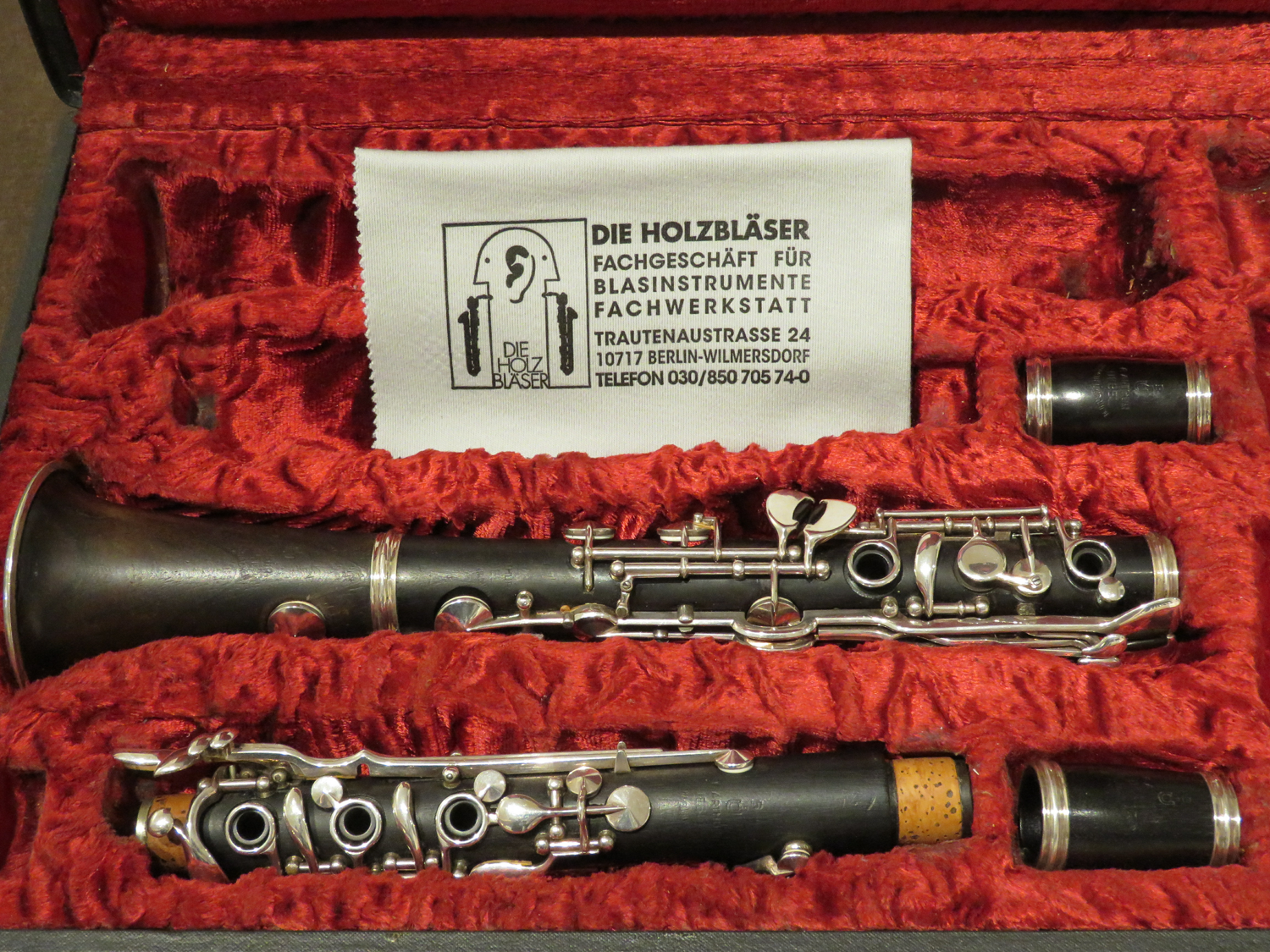 B-Klarinette von F.A.Uebel-Klarinetten im Volloehler-System mit tief E-Verbesserung und abstellbaren H-Cis-Triller. Komplett mit zwei Birnen. Das Instrument befindet sich in sehr gutem Zustand. Verkauf im Doppelkoffer im Kundenauftrag.