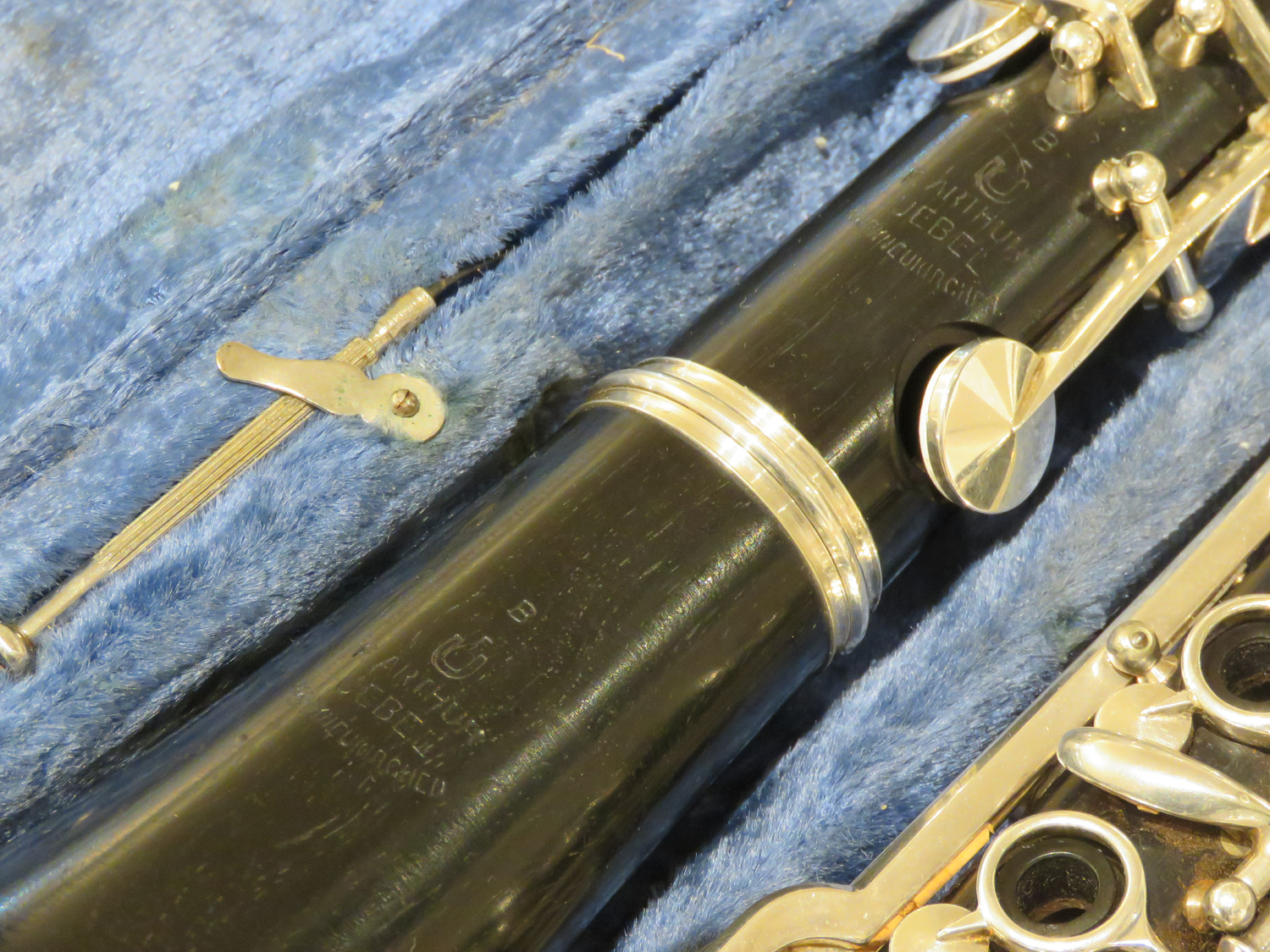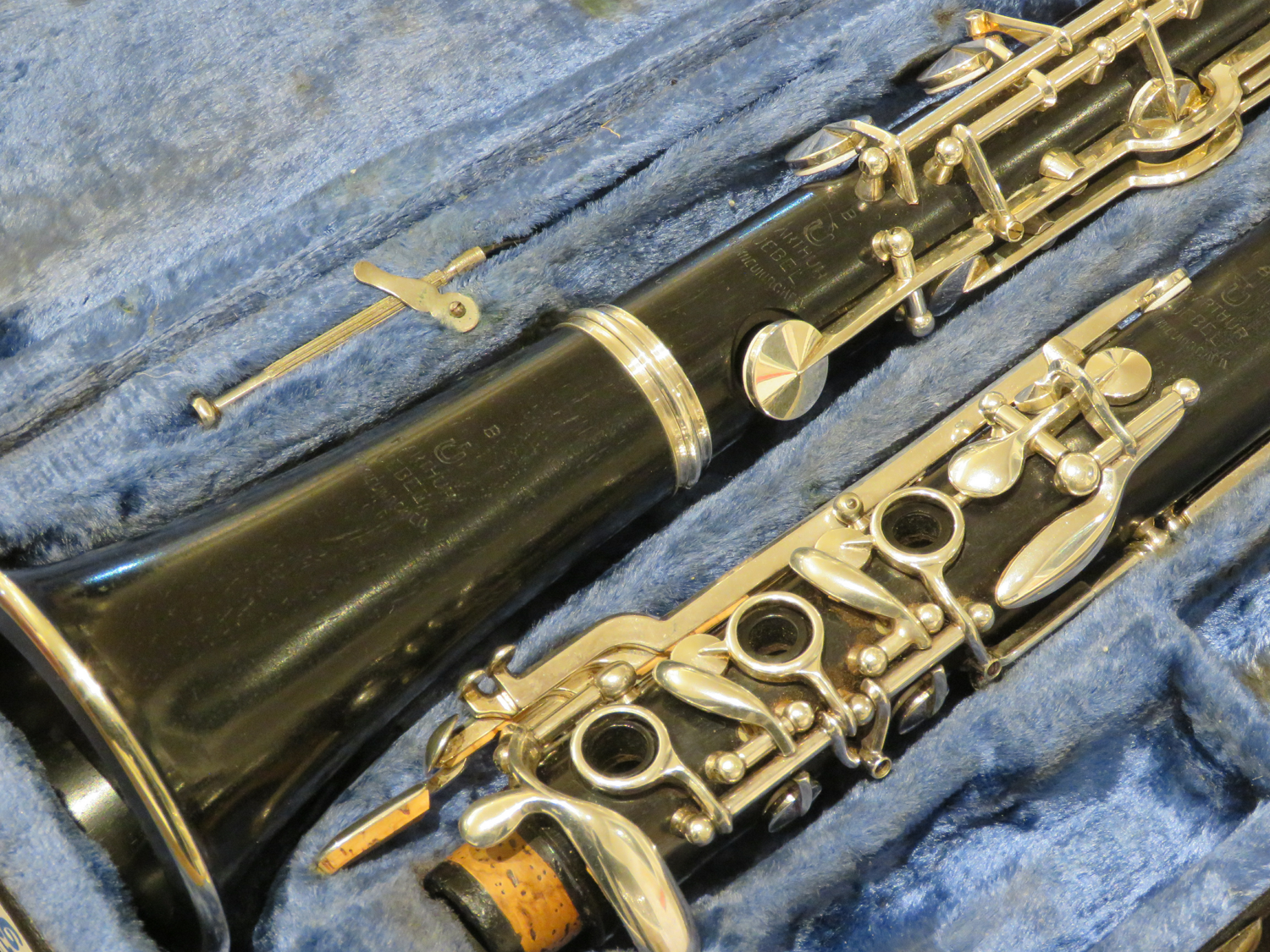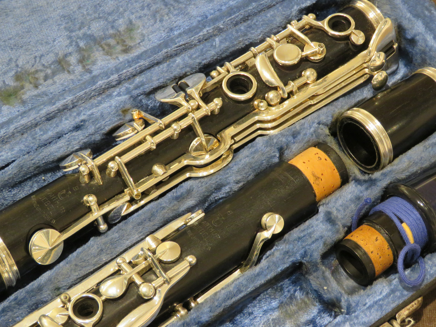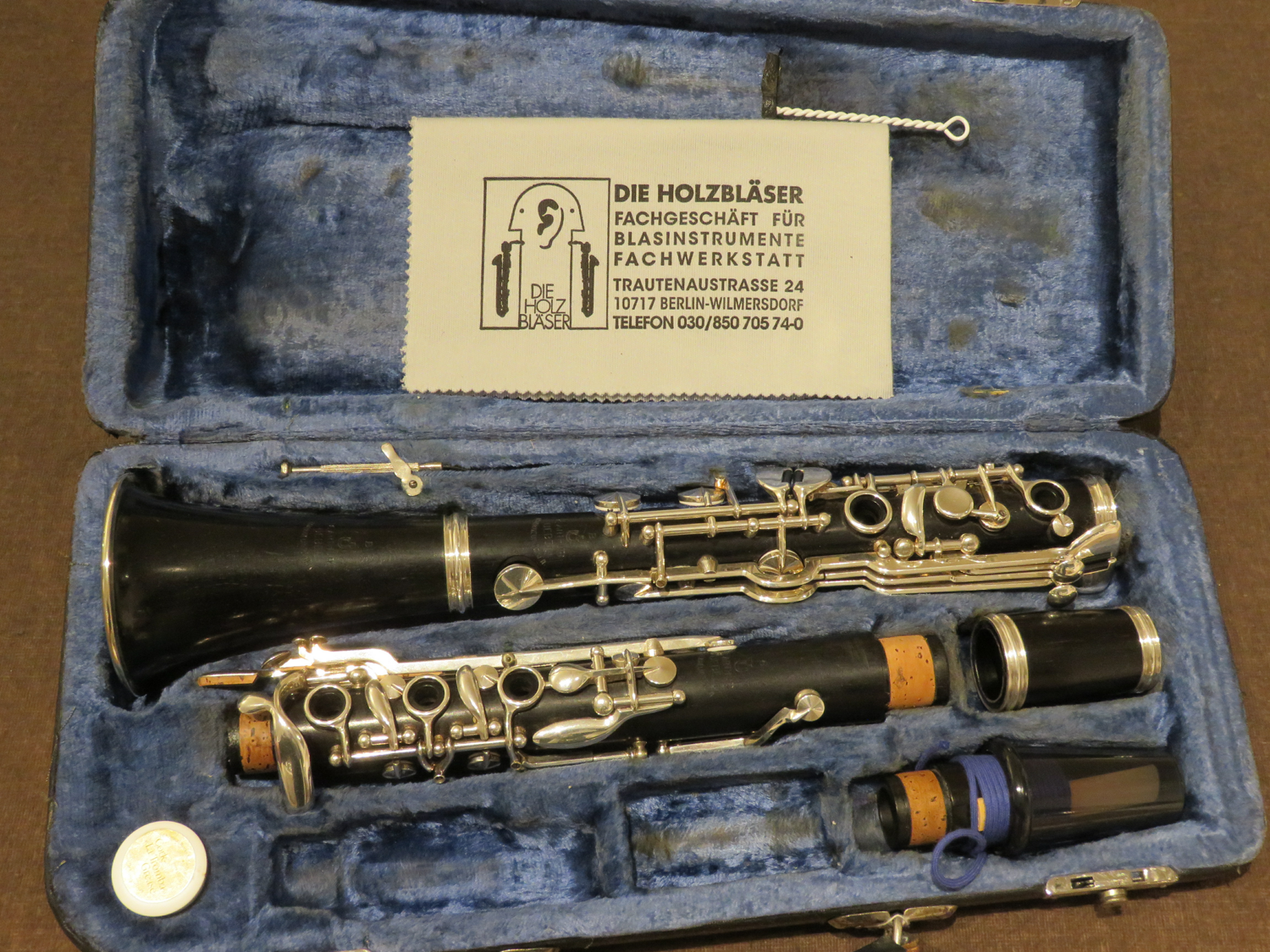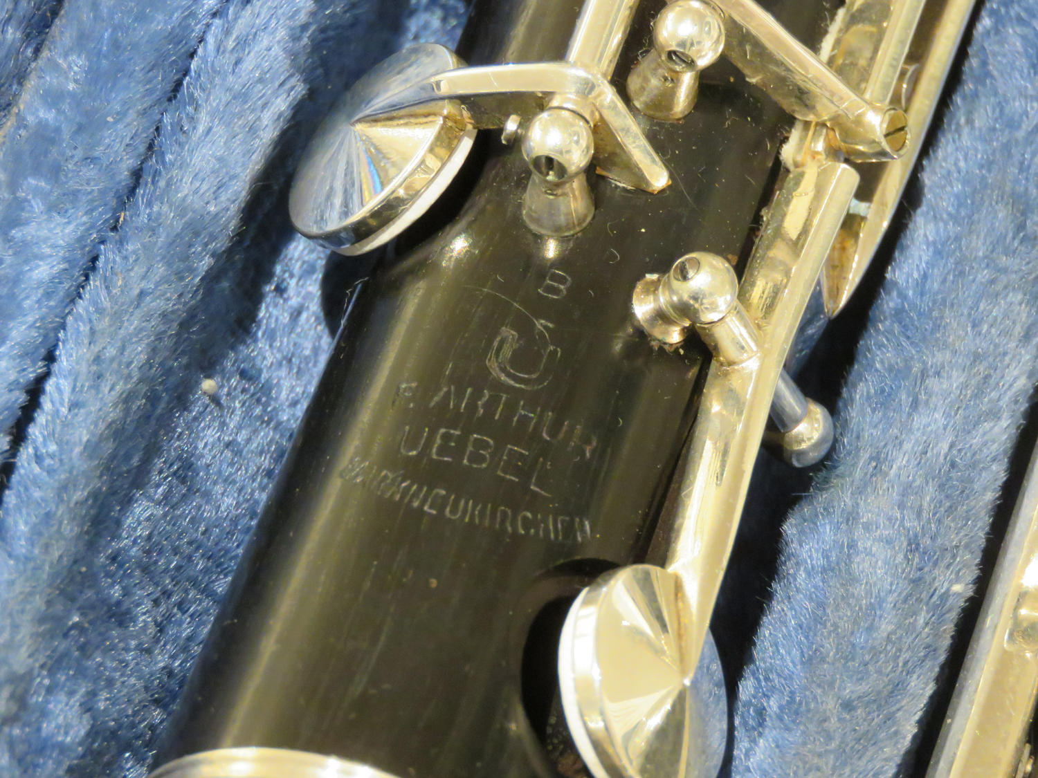 Professionelle Klarinette F.A.Uebel, vermutlich 1960er Jahre gebaut. Grenadilholz mit versilberter Mechanik. 24 Klappen, 5 Ringe, 1 Griffplatte (Oehler-Mechanik), Gabel B-und F-Mechanik, doppelte C/F Klappe, tief E/F-Verbesserung, mit Birnen und Mundstück und Formetui, Generalüberholt, sehr guter Zustand.