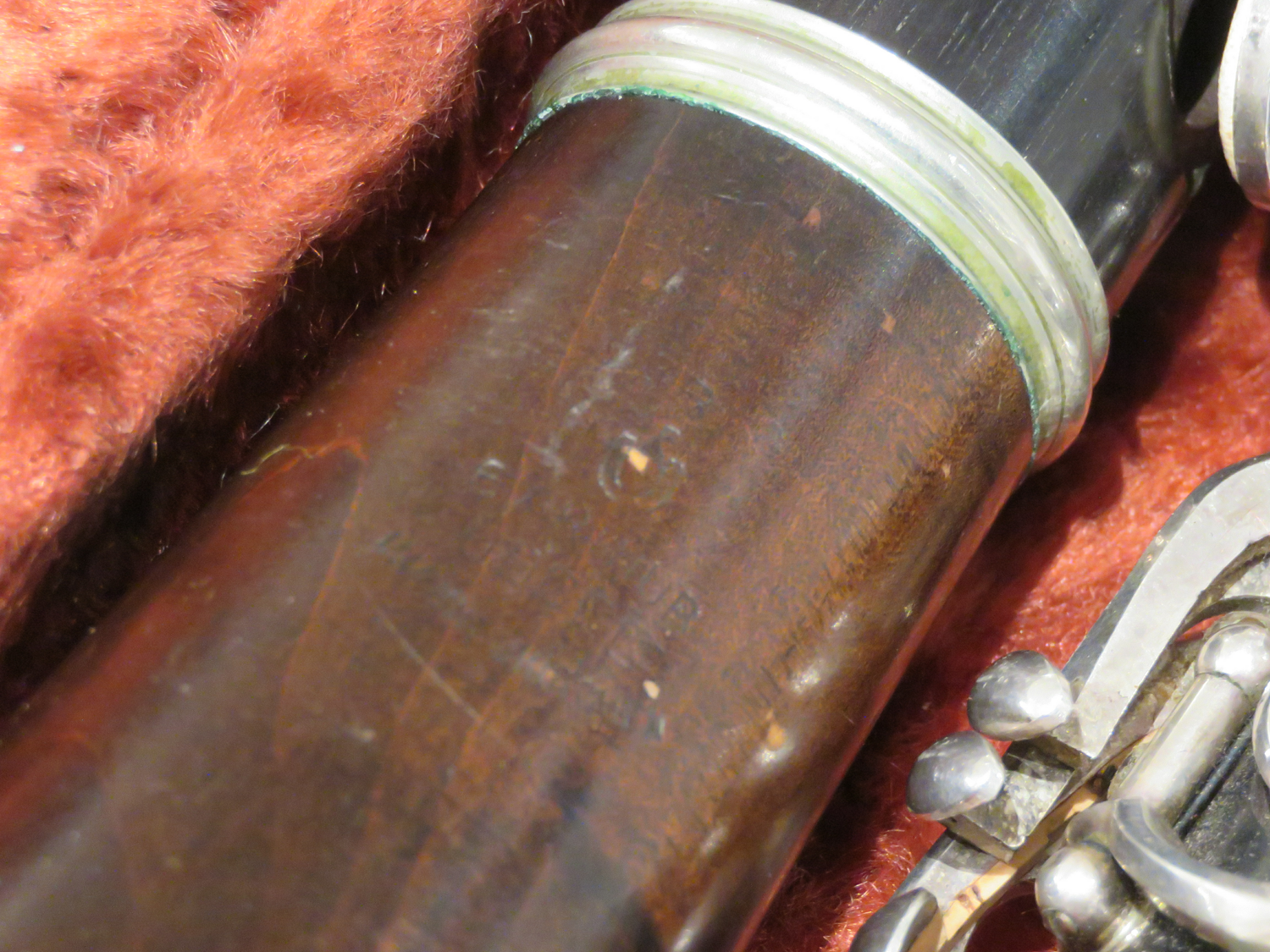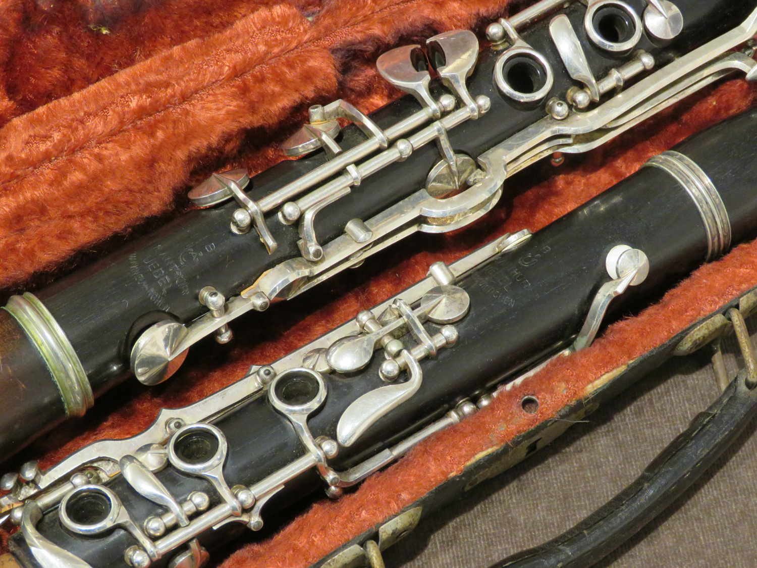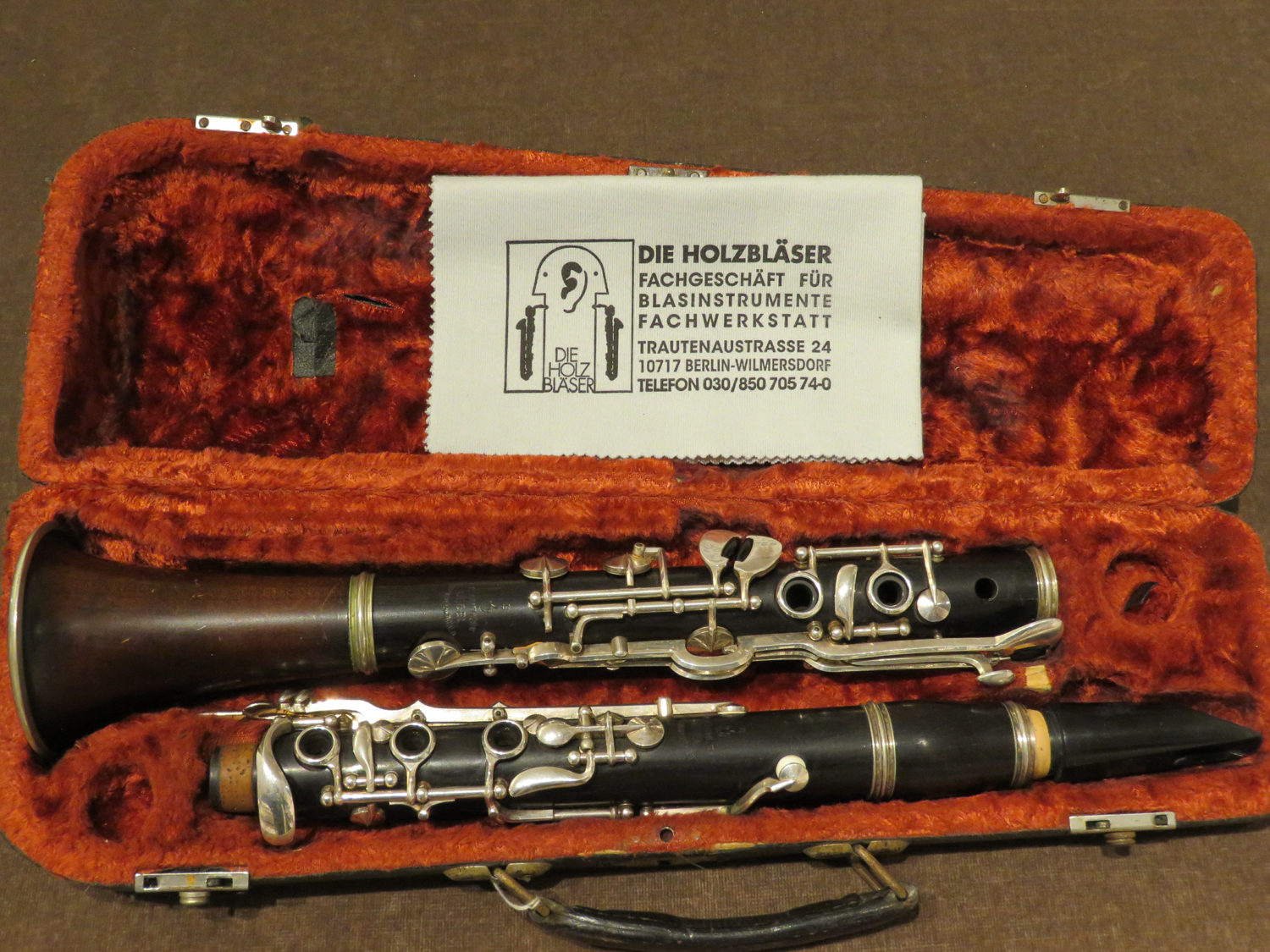 Korpus aus Grenadillholz (Ser.Nr. 15tsd.), 18 Klappen, 5 Ringe, 4 Triller, Oktavverbindung, versilbert, incl. Mundstück, Zubehör undEtui. Instrument ist nicht überholt gut spielbar.