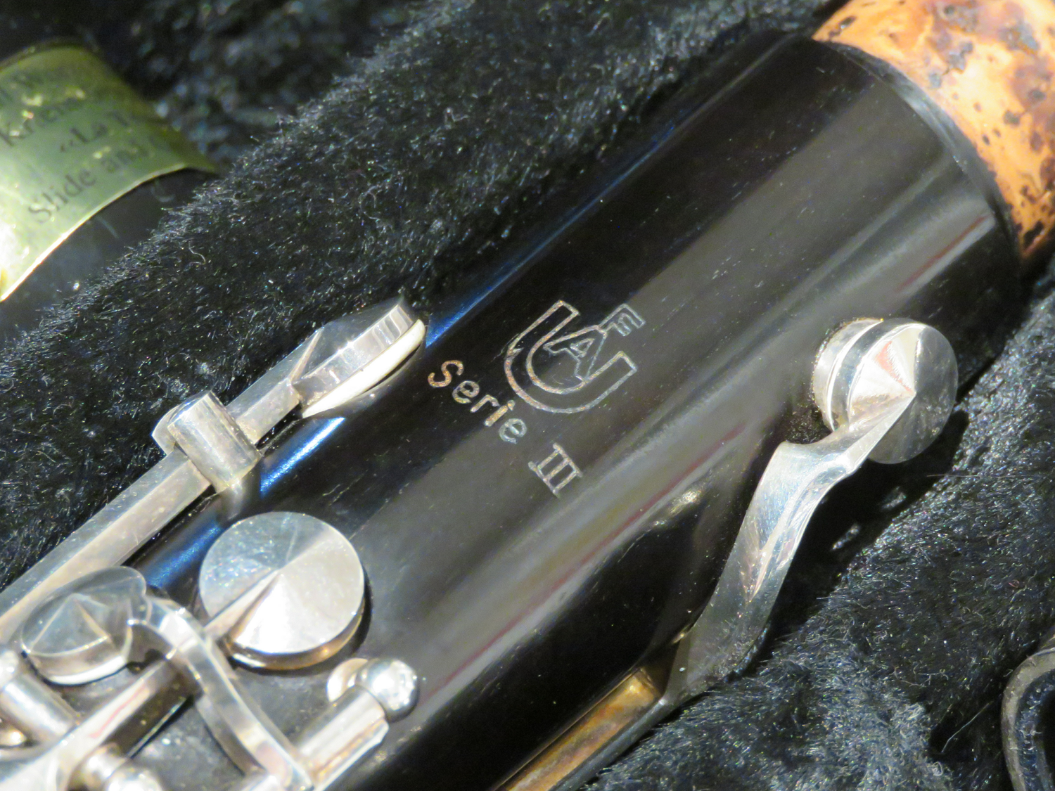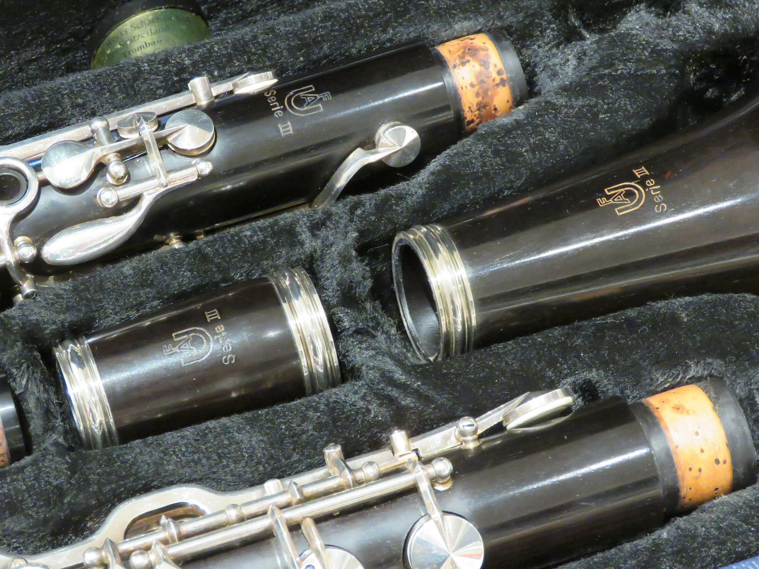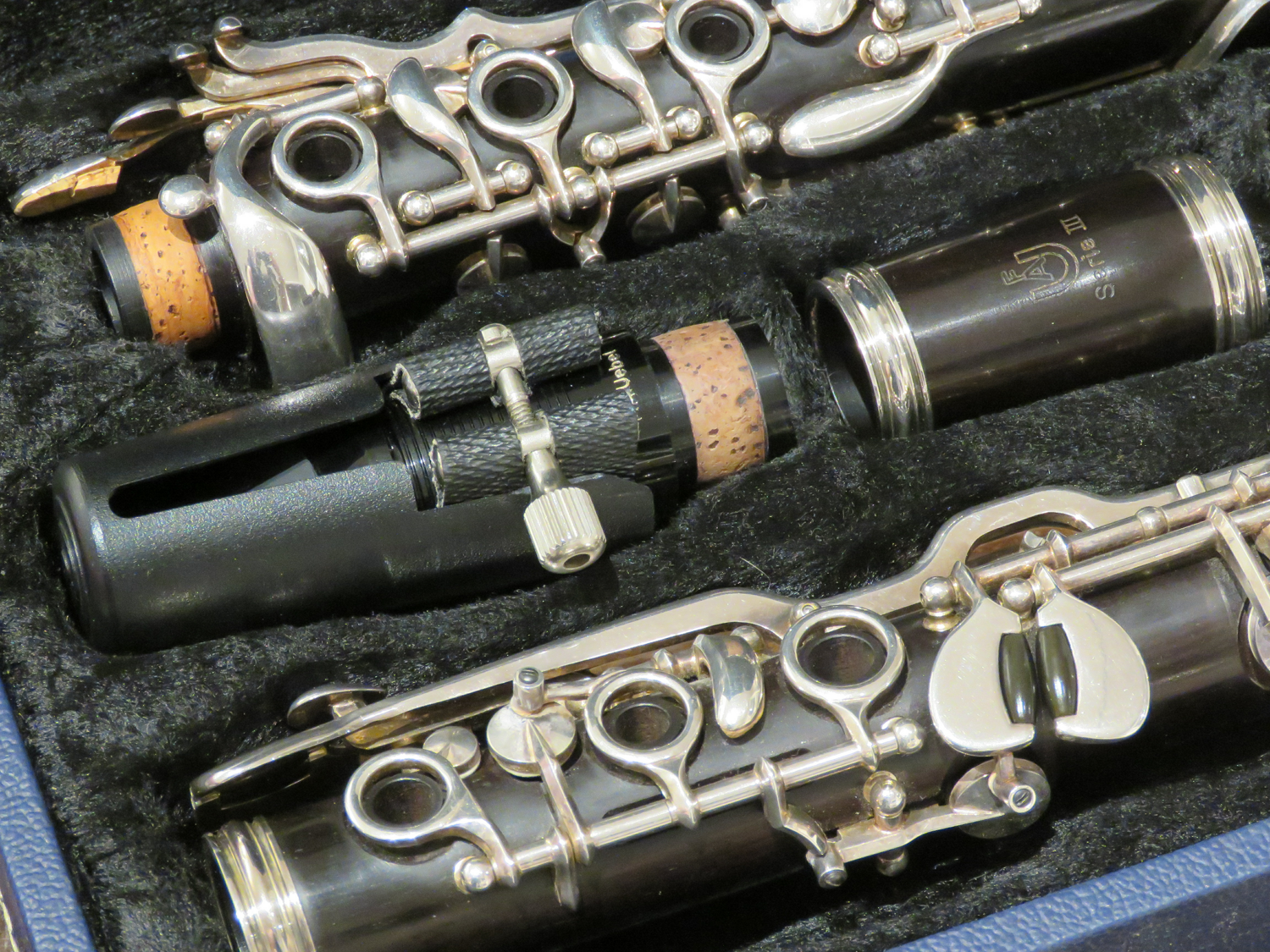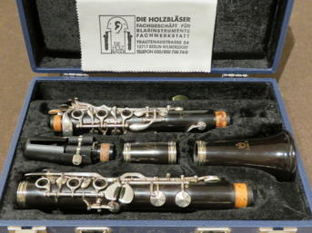 gebrauchte Klarinette Uebel 622/III im deutschen System, guter Zustand, Korpus aus Grenadillholz, 22 Klappen, 6 Ringe, Gabel-B- undF- Mechanik, Überblasklappenverbindung, 4 Triller, versilberte Mechanik, incl. Mundstück im Koffer
