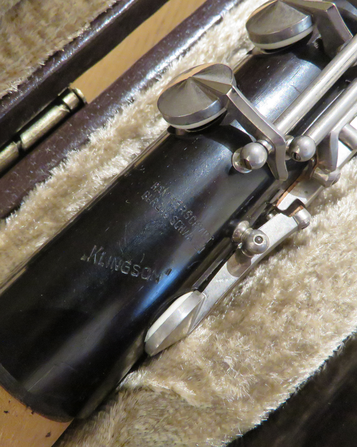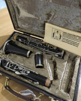 B-Klarinette von Hammerschmidt/Burgau mit 17 Klappen und vier Ringen mit Birne und Mundstück im Etui.Grenadilholz mit vernickelter Mechanik. Das Instrument ist spielbar, Polster sind schon älter.