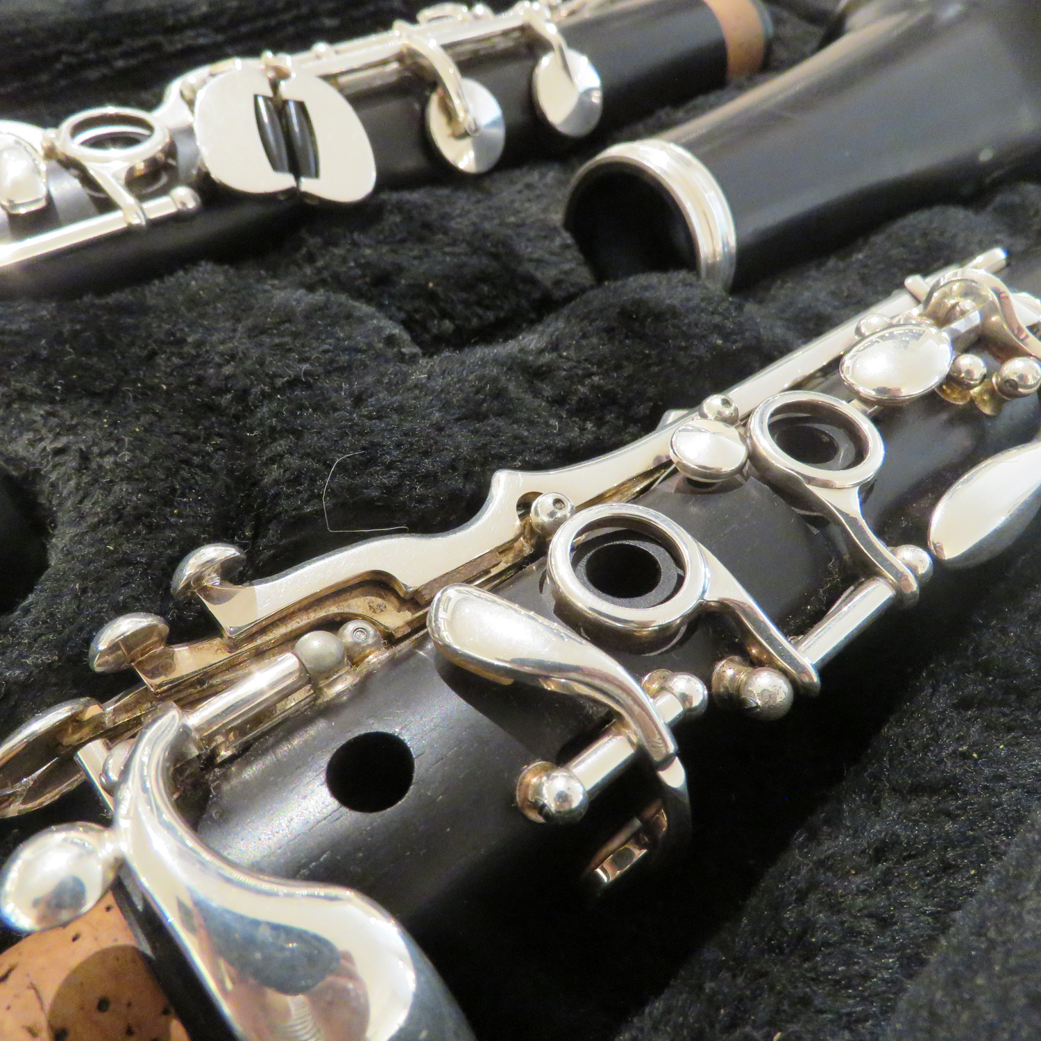 B-Klarinette im deutschen System, guter Zustand, 18 Klappen, 4 Ringe, versilberte Mechanik, Korpus Grenadillholz, aus der Vermietung, Riss im Becher (repariert/ geklebt)