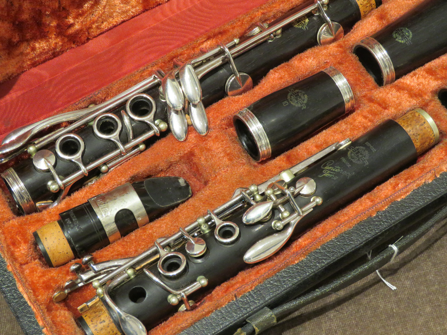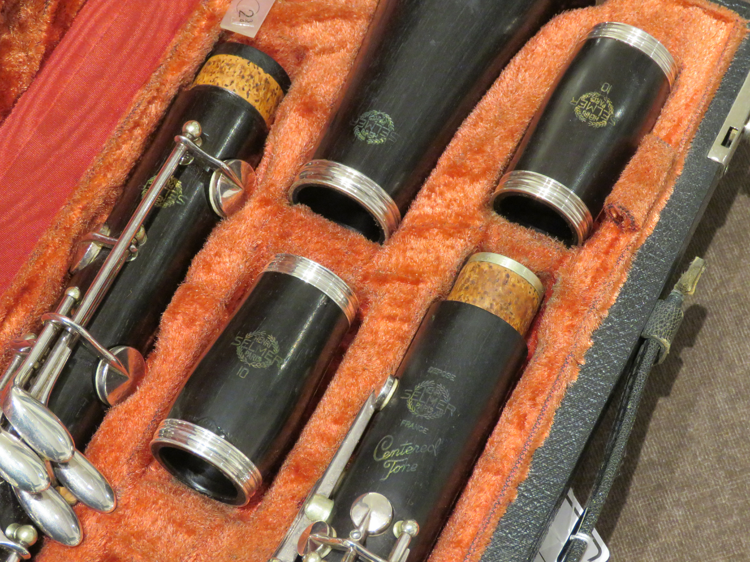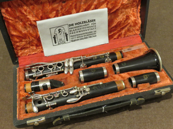 Böhm B-Klarinette von Selmer. 5 Ringe, 17 Klappen, versilberte Mechanik. Mit zwei Birnen und einem Mundstück im Etui. Ein geklebterRiss.