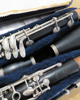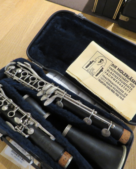 Vollboehm bis tief-Es mit artikuliertem Gis und Es-Heber links,Grenadilholz Neusilbermechanik, spielbarer Zustand, Polster schon älter, mit Kompaktetui.
