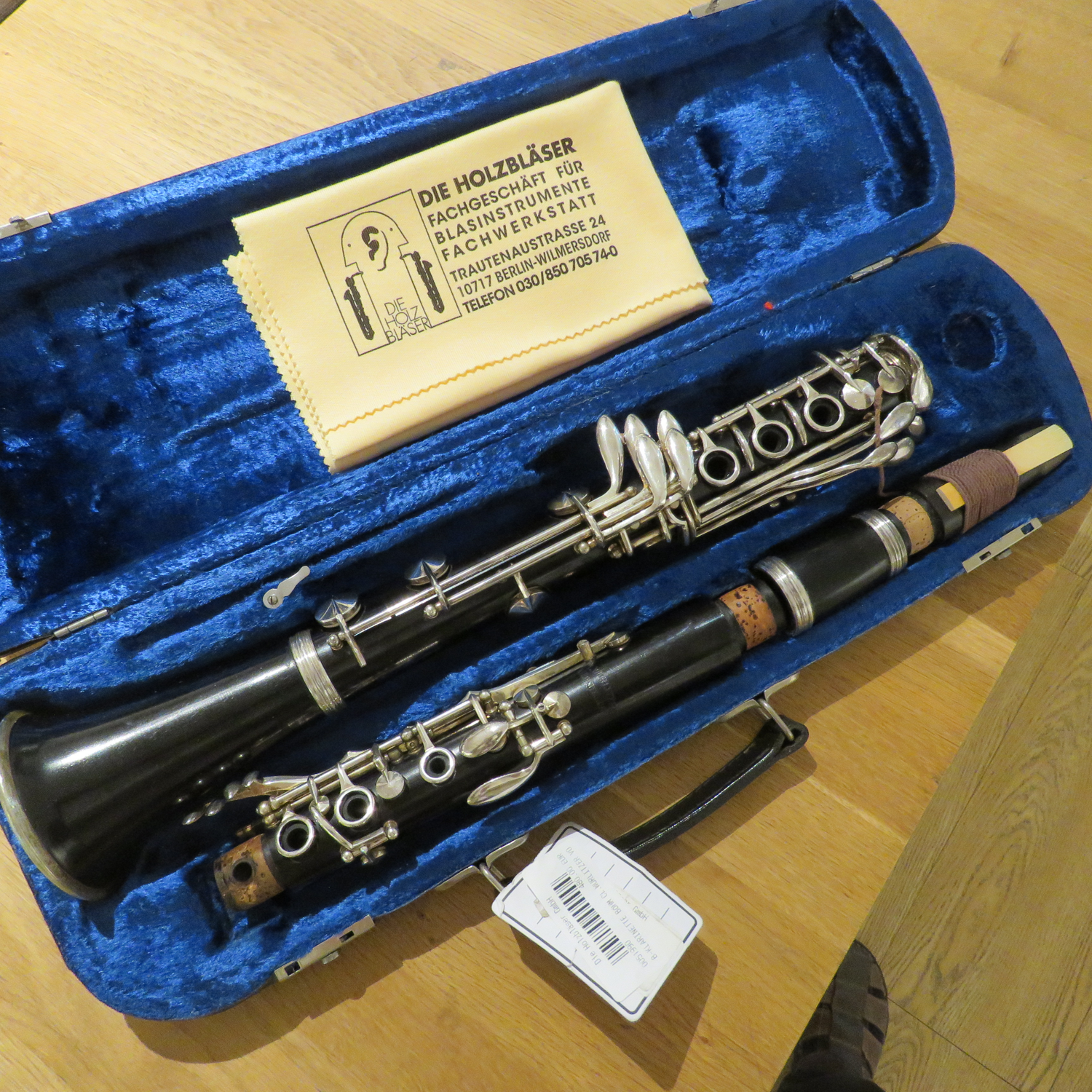 Klarinette Vollboehmsystem mit tief-Es mit sieben Ringen,19 Klappen, mit Es-Heber,Grenadilholz, versilberte Mechanik, bedingt spielbarer Zustand (Holzriss,reparabel und ältere Polster) mit Birne im Formetui, nicht überholt.