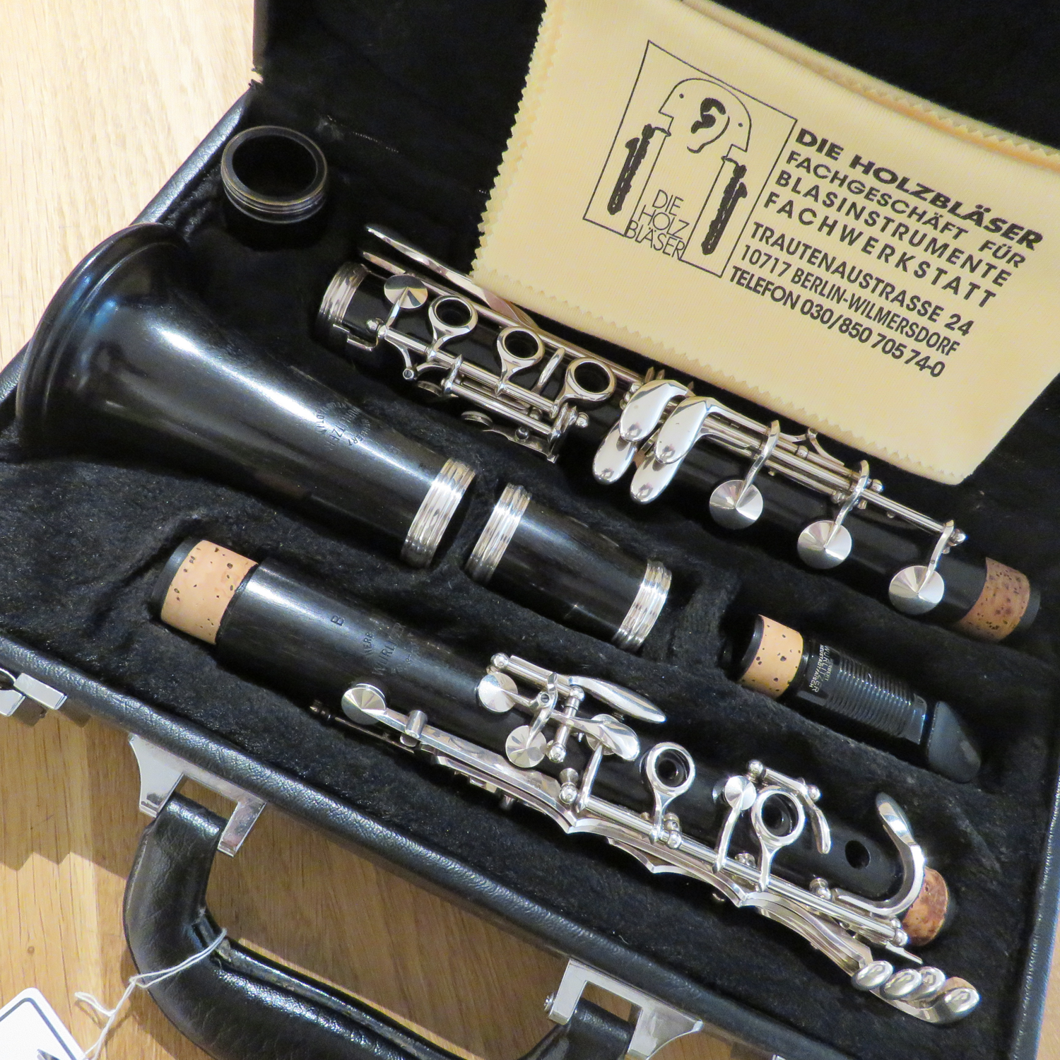 B-Klarinette von Herbert Wurlitzer im Reform-Böhm-System 1962 gebaut, sechs Ringe, zusätzlich mit B1 Resonanzmechanik, h/Fis- Resonanzklappe, versilberte Mechanik, komplett mit Mundstück im Koffer, guter Zustand, Verkauf im Kundenauftrag.