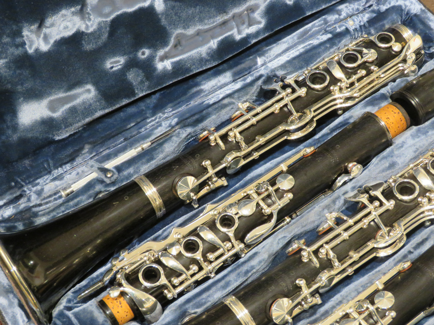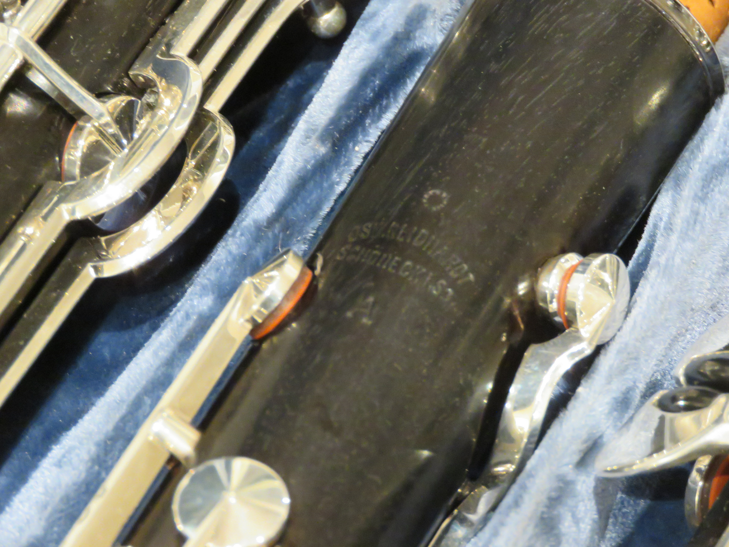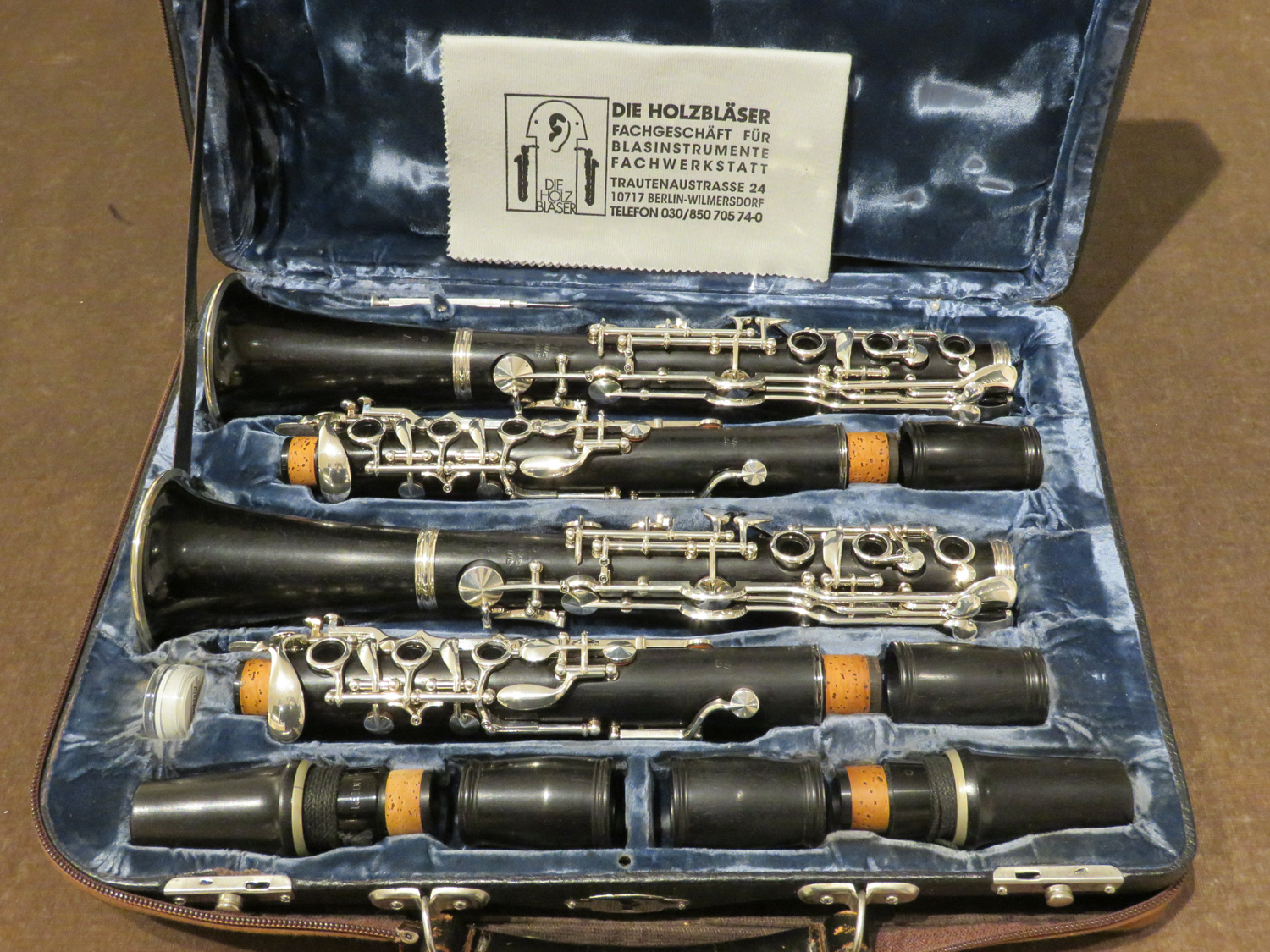 Satz Neidhardt-Klarinetten aus dem Besitz eines Orchestersolisten. Die Instrumente wurden 1993 gebaut. Neidhardt/Oehlersystem mit sechs Ringen und tief-E/F-Verbesserung, Grenadilholz mit versilberter Mechanik, komplett mit vier Birnen und zwei Mundstücken. Besonderheit: Die Birnen sind mit Ringen aus Grenadilholz versehen (orig. Metallringe sind separat dabei). Die Instrumente sind mit Clarissono Polstern ausgestattet. Bestzustand. Im Doppelkoffer mit Überzug. Verkauf im Auftrag.