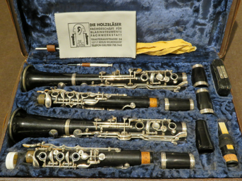 Satz B/A-Klarinetten von Clemens Wurlitzer in Wernitzgrün gebaut. Grenadilholz, Volloehler-Mechanik mit versilberten Klappen und tief E-Verbesserung. Komplett mit vier Birnen und einem Mundstück im Doppelkoffer mit Überzug. Aus dem Besitz eines Orchestersolisten. Die Instrumente sind in gutem Zustand, letztmalig überholt/gewartet 2017.
