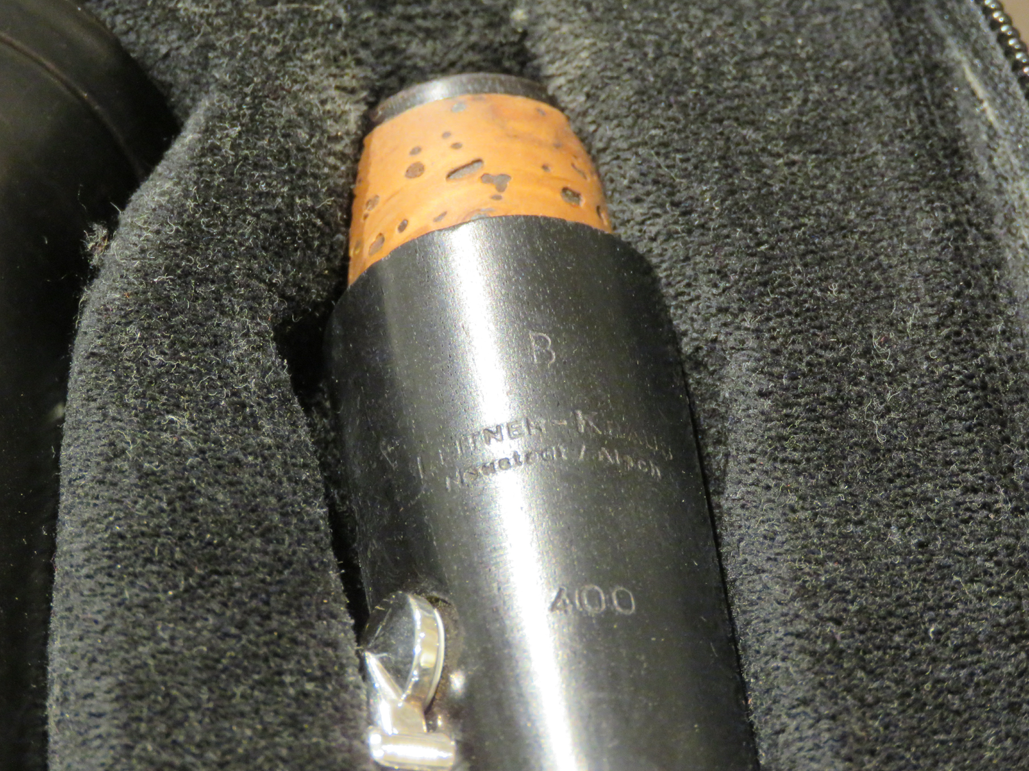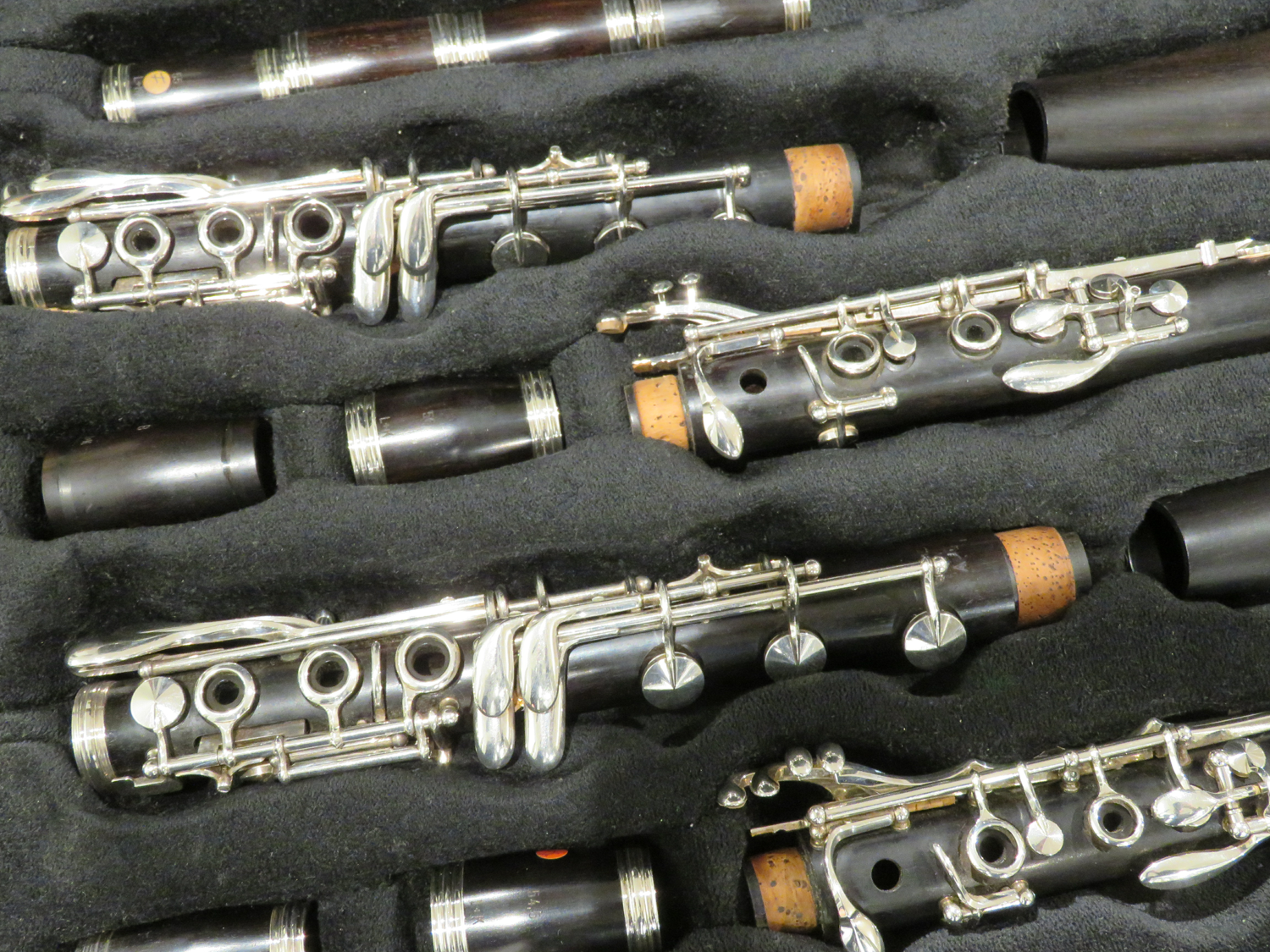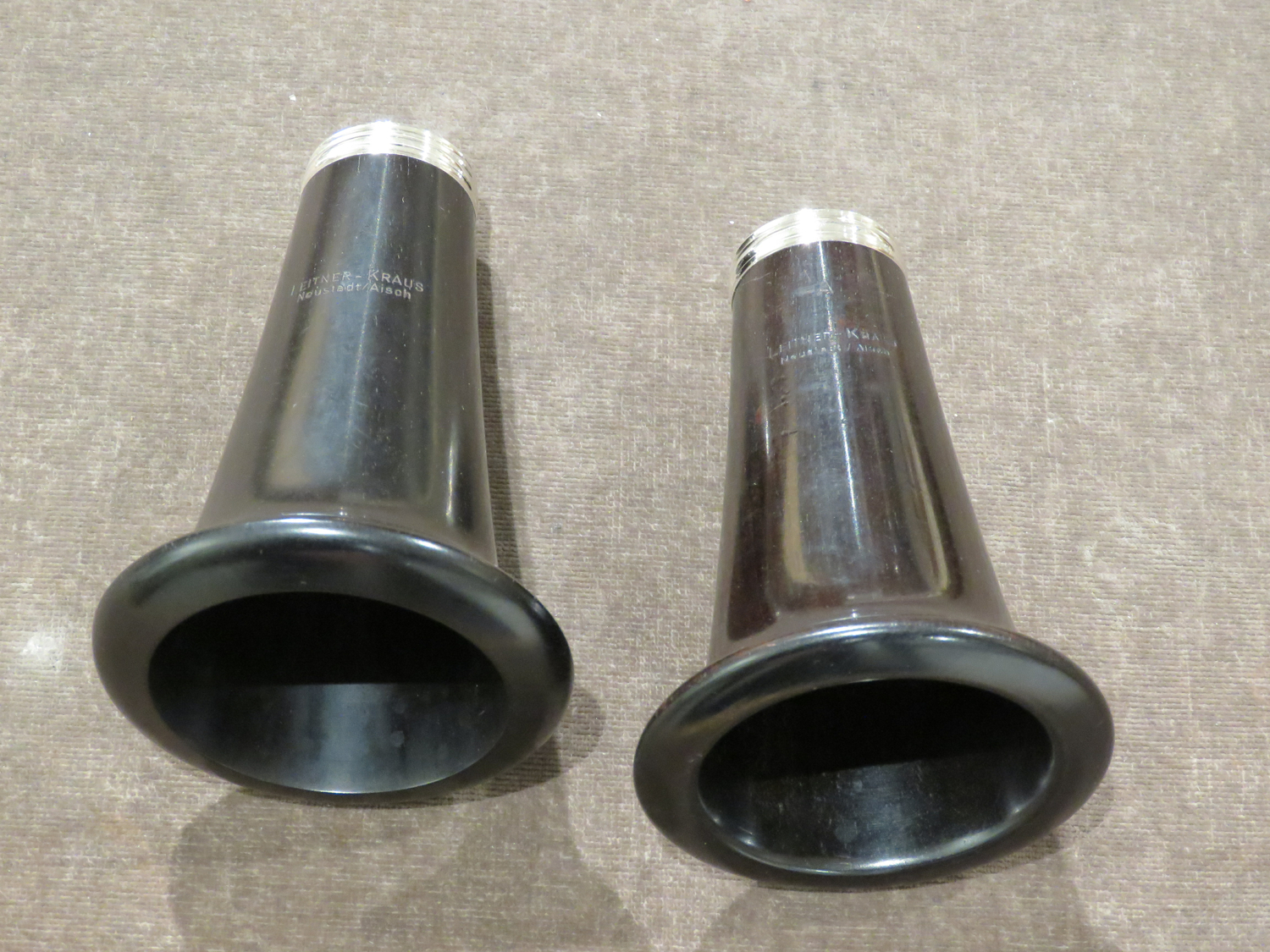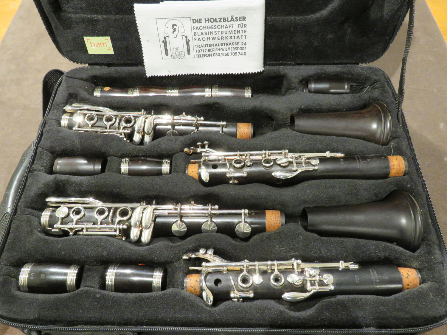 Satz Reform-Boehm-Klarinetten von Leitner&Kraus, Modell 400 mit neun Birnen und zwei zusätzlichen Bechern im Doppeletui. Die Instrumente sind aus Grenadilholz mit versilberter Mechanik gebaut. Ausstattung: Sechs Ringe,B1-Resonzmechanik, D2-Resonzklappe, Fis2-Resonanzklappe.Sehr guter Zustand, Verkauf im Kundenauftrag.