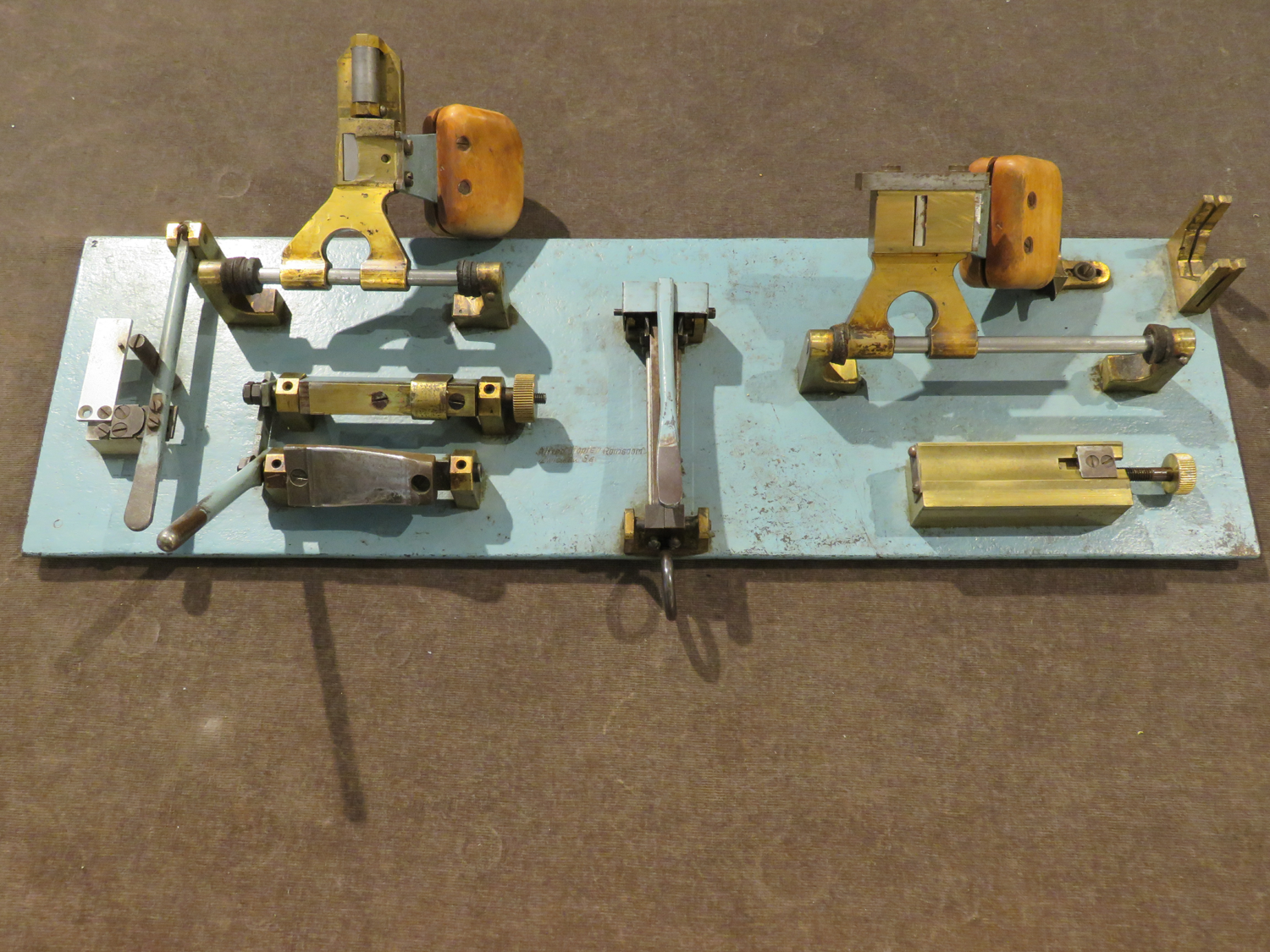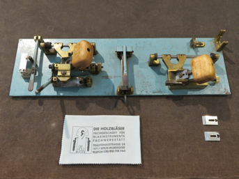 Blattkopiermaschinensatz von Klopfer, mit Fassonhobel für die Blattoberseite ein Planhobel für die Blattunterseite, Abschneider, Blattabschneider und Blattseitenfassonschneider. Einteilige Ausführung. Mit Ersatzmesser. Aus dem Besitz eines Orchestermusikers