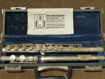 Silberrohrquerflöte von Pearl Modell 97E, Mechanik Neusilber, versilbert. Die Flöte ist 41 Jahre alt und befindet sich in gutem Zustand. Die letzte Generalüberholung fand im Jahr 2008 statt. Wir verkaufen die Querflöte im originalen Etui. Ausstattung: Deckelklappen, C-Fuß, E-Mechanik und vorgezogenes G