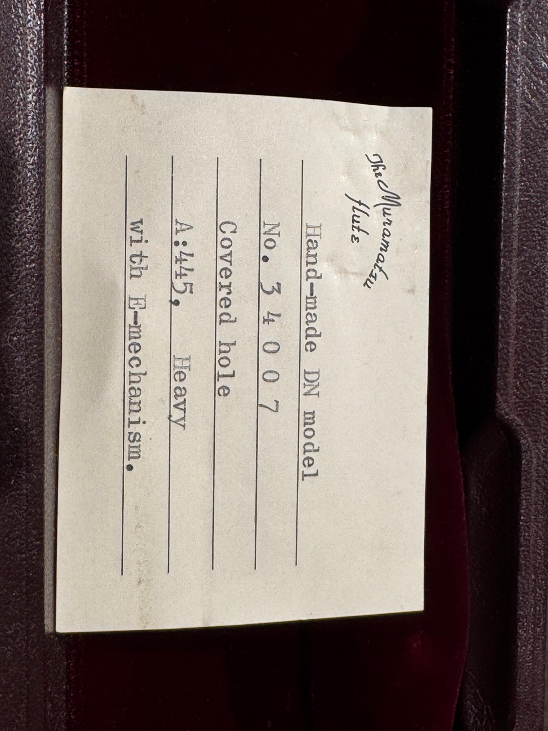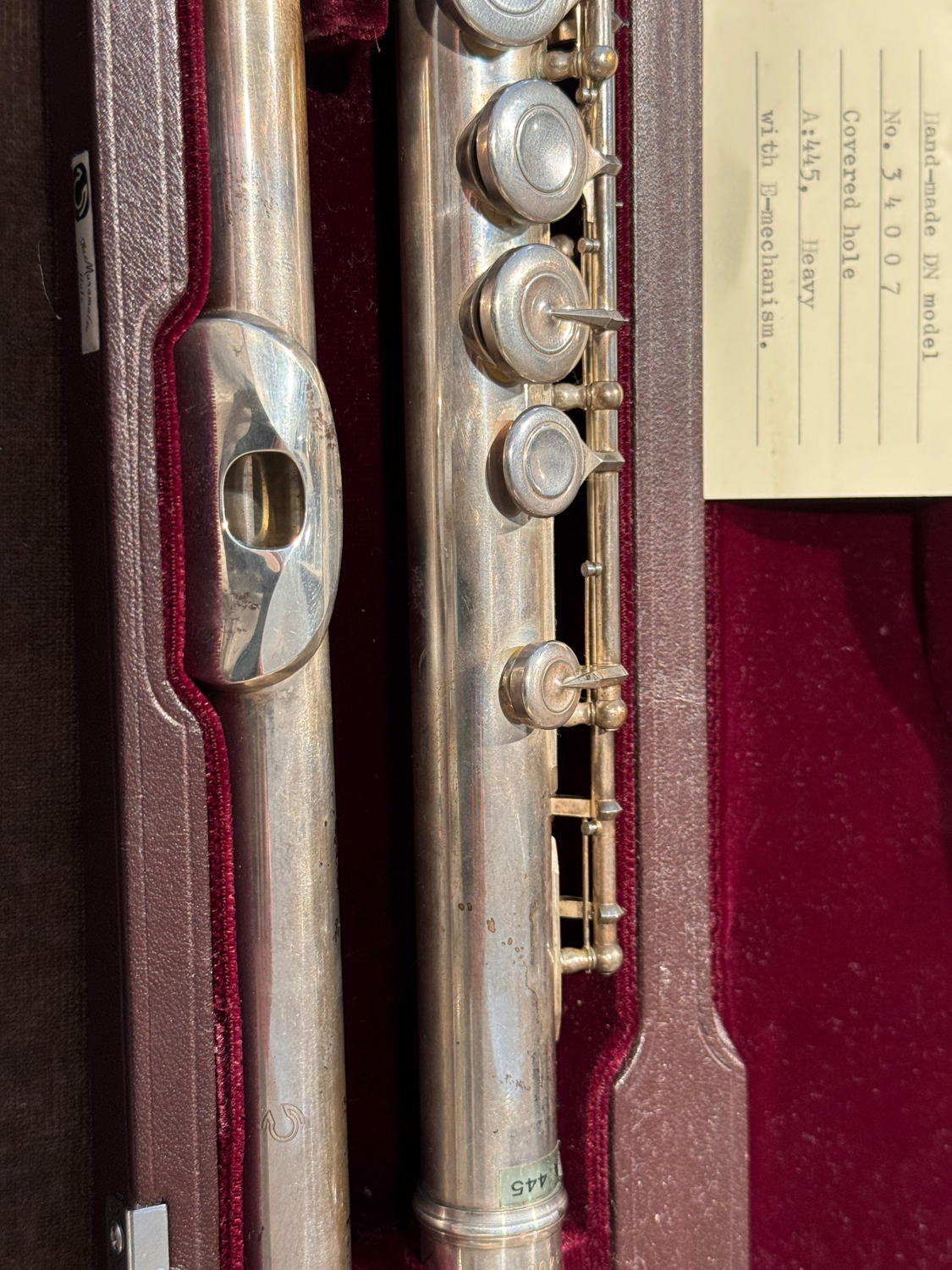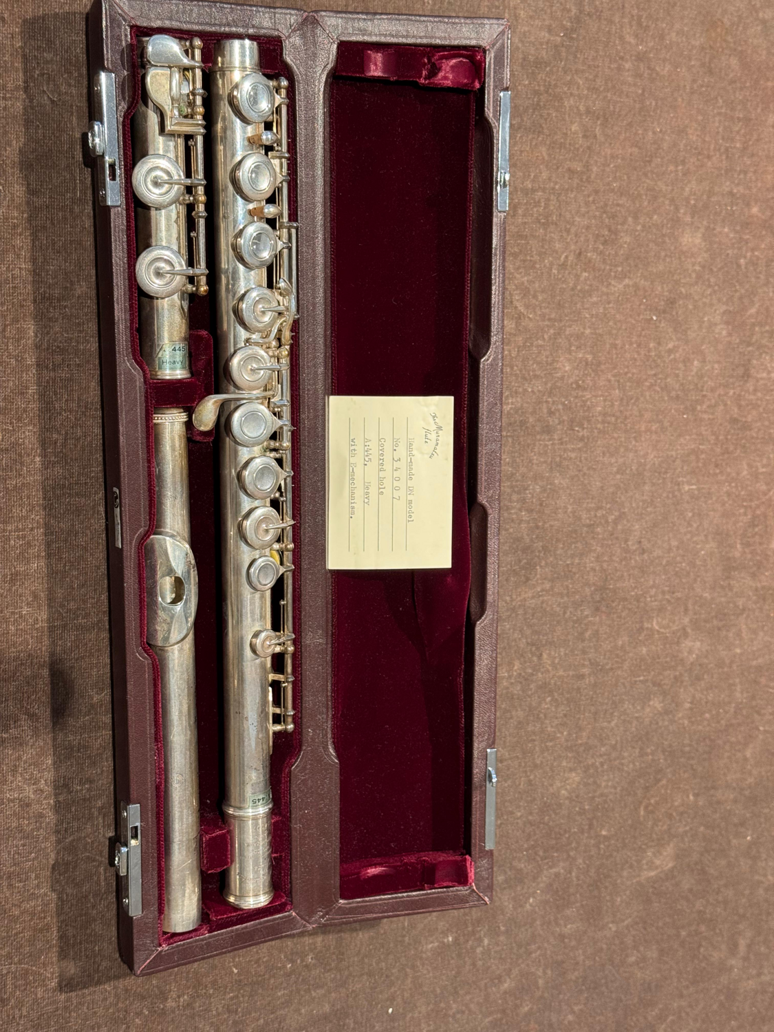 Silberrohrflöte Muramatsu DN, stark gebraucht, Instrument teilweise angelaufen, mit E-Mechanik, mit Deckelklappen Reform-Mundlochplatte, heavy, anspielbar, jedoch überholungsbedürftig, Stimmung 445Hz, Etui sehr gut erhalten, Verkauf im Auftrag