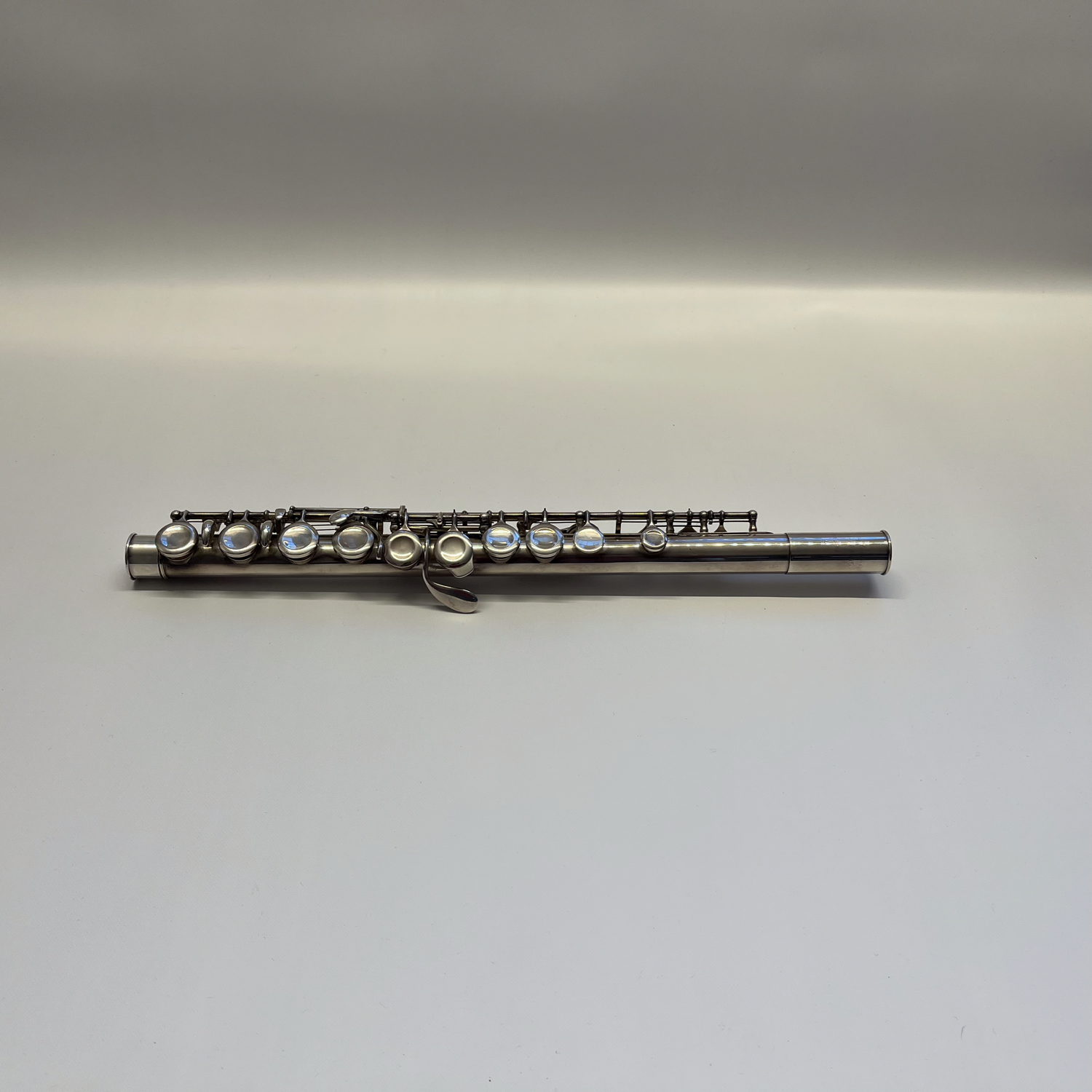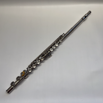 Vollsilberflöte von Philipp Hammig, Markneukirchen, aus 900er Silberin den 1960er Jahren gebaut. Die Flöte ist bedingt anspielbar und befindet sich in einem überholungsbedürftigen Zustand. Wir verkaufendie Flöte mit Etui und Etuiüberzug im Kundenauftrag. Ausstattung: Deckelklappen, C-Fuß, E-Mechanik, vorgezogenen G, mit Rollen an C-, Cis- und Dis-Klappe und Hoch-A-G-Triller
