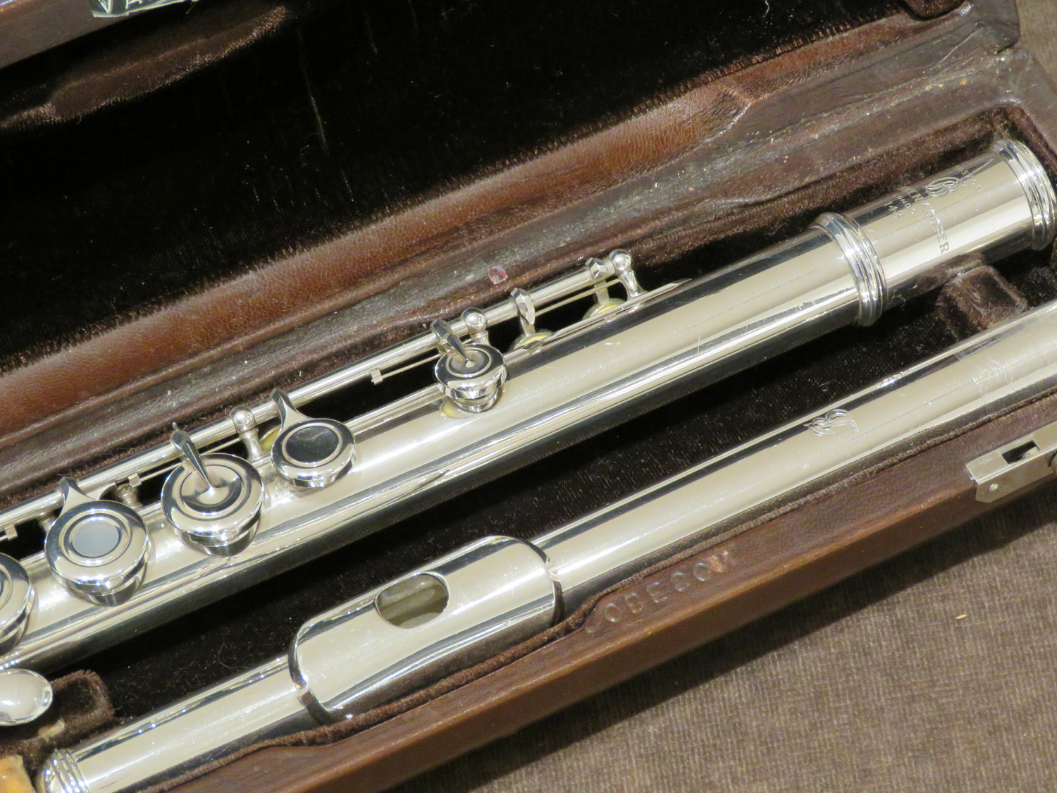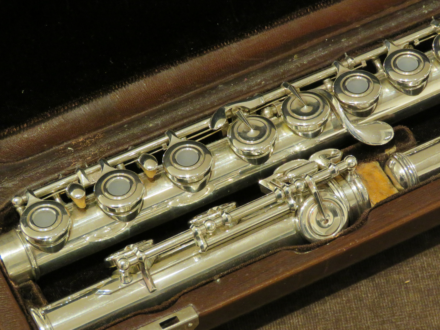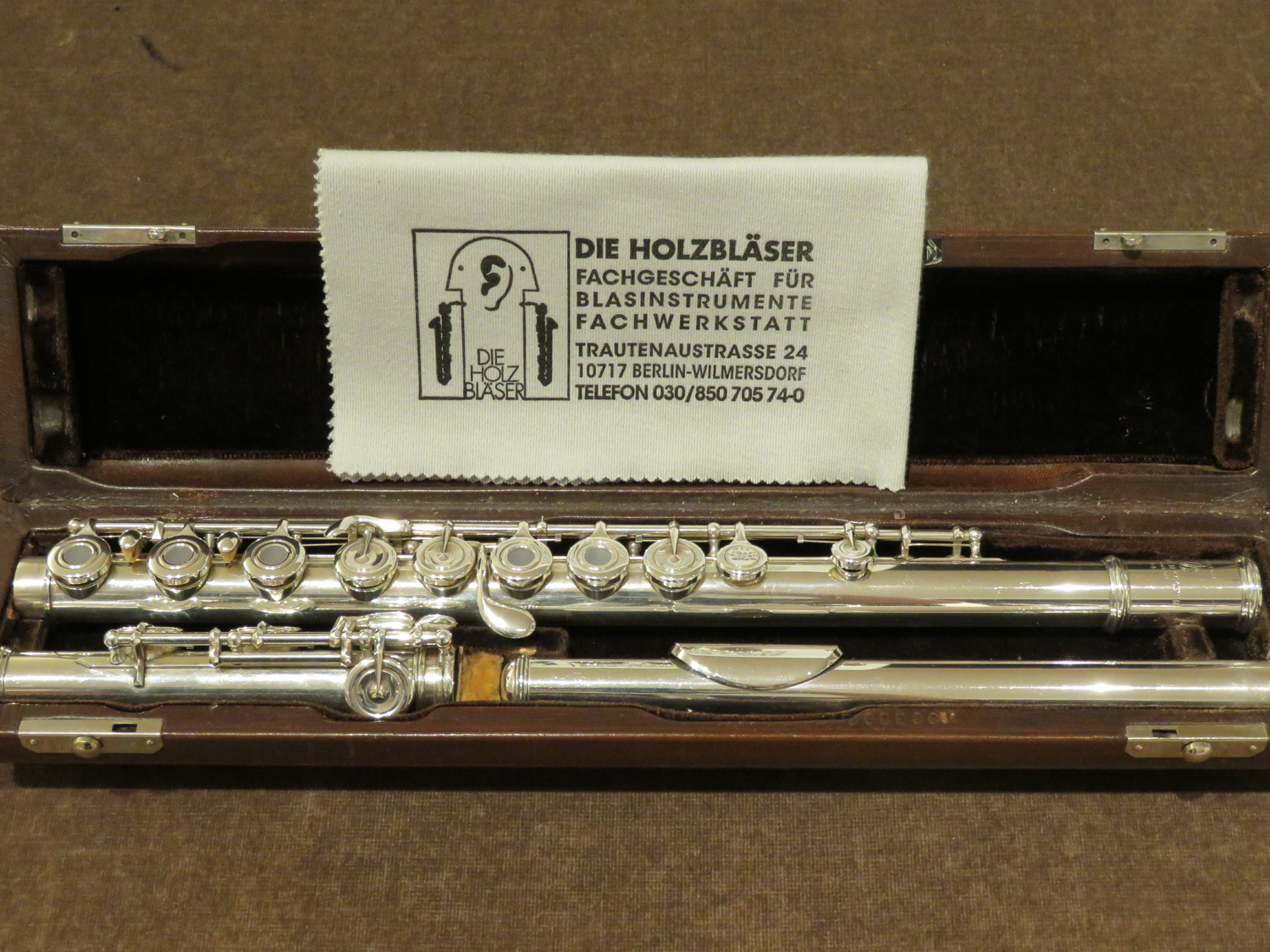 Vollsilberquerflöte von Brannen-Cooper. Die Flöte ist 1980 gebaut und befindet sich in einem guten Zustand. Wir verkaufen die Querflöte im Kundenauftrag mit Etui und Etuiüberzug. Ausstattung: Ringklappen, ohne E-Mechanik, C-Fuß, inline G und gelöteten Tonlochkaminen