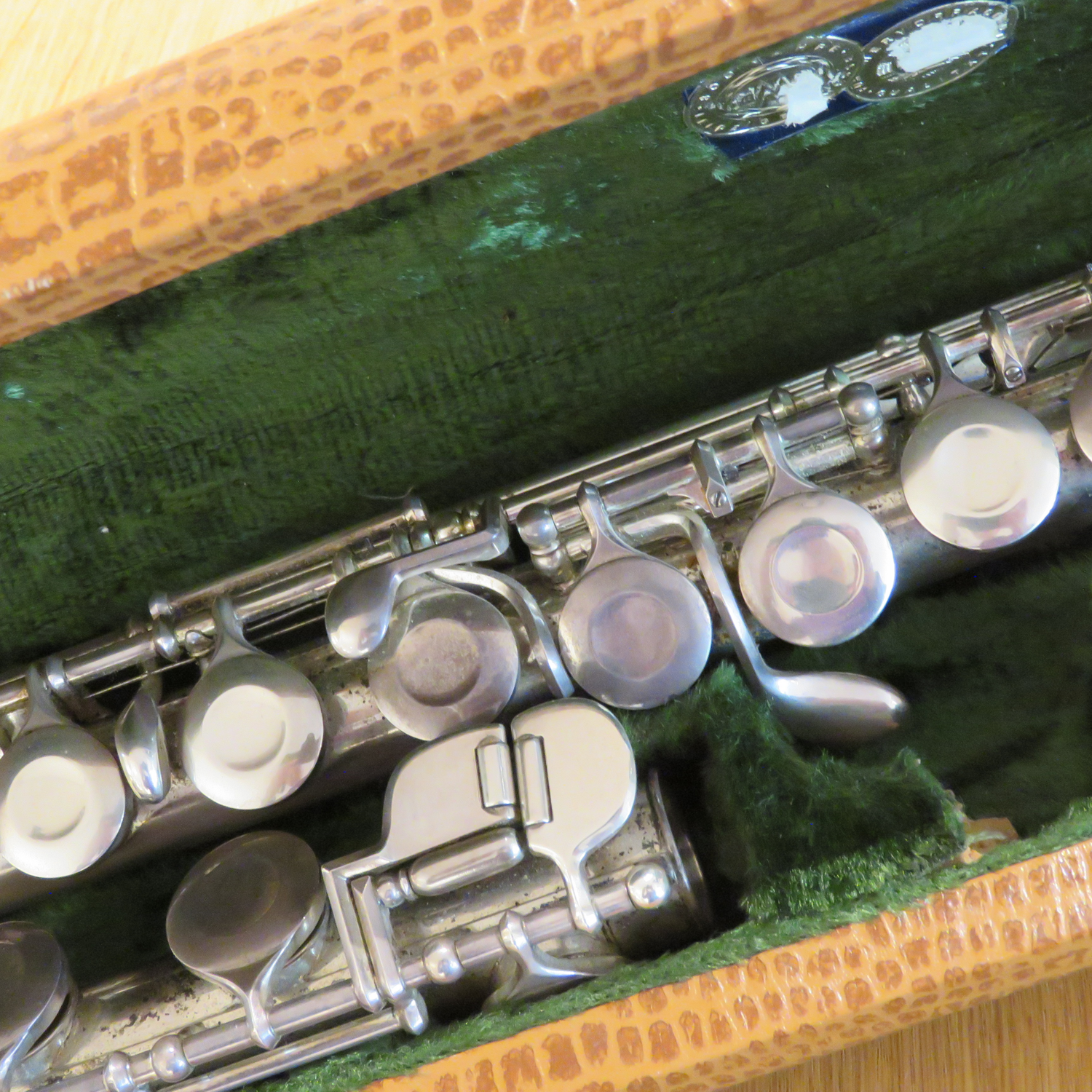 Vollsilberquerflöte von August Richard Hammig, Signiert: Aug.Rich.Hammig,Markneukirchen,5530, mit Stempel für Künstler- instrumente. Wir verkaufen die Querflöte im Kundenauftrag mit Etui und Etuiüberzug. Ausstattung: Deckellappen, E-Mechanik, C-Fuß und vorgezogenes G. Die Flöte wird ohne Kopfstück angeboten. Instrument ist überholungsbedürftig.