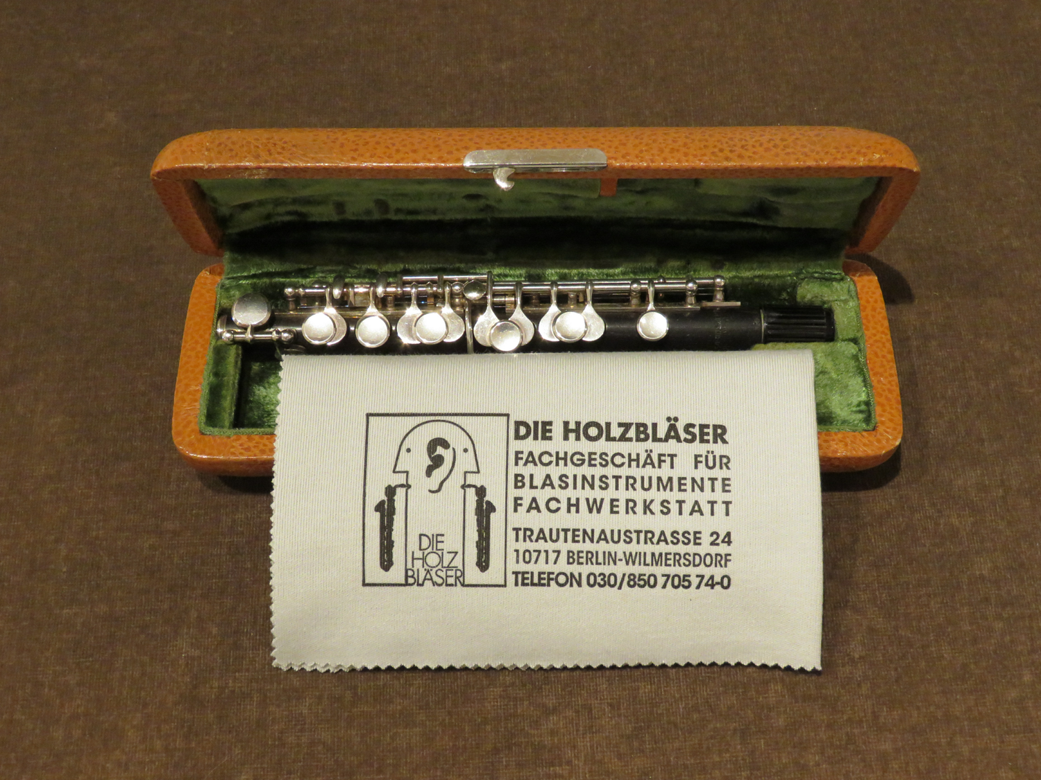 Piccolo von Ph. Hammig aus Grenadillholz, ohne Kopfstück. Das Piccolo verkaufen wir im Kundenauftrag. Es befindet sich in sehr gutem Zustand. Der Zapfen ist allerdings sehr weit, sodass die Kopfstücke, die wir von Hammig lagernd haben, nicht auf den Zapfen passen.