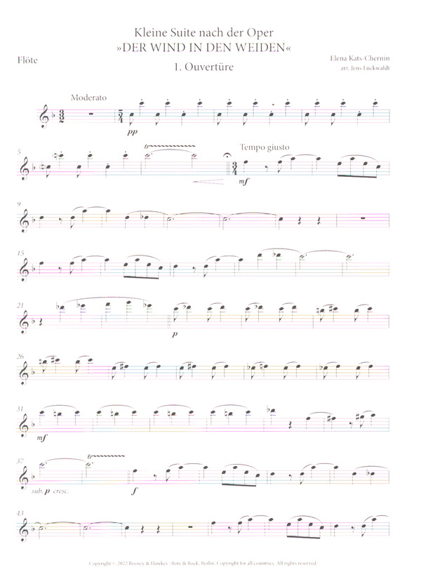 | Mit 'Der Wind in den Weiden', uraufgeführt 2021, schuf Elena Kats-Chernin die erste Opern-Bearbeitung des berühmten Buches von Kenneth Grahame. Vorliegende kleine Suite für Bläserensemble vereint nach Vorbild der klassischen Harmoniemusiken einige der eingängigsten Nummern des Stücks und stellt die Protagonisten vor: die Stimmen der Natur im eröffnenden Walzer, die muntere Ratte mit ihrem 'Der Fluss ist mein Freund', den angeberischen, von den Menschen ins Gefängnis geworfenen Kröterich mit seinem Lamento 'Ich arme Kröte', die Suche von Ratte, Maulwurf und Dachs nach ihm in 'Wo ist er?', sowie den festlichen Schlusschor. Alle vier Instrumente kommen gleichberechtigt und ihrer Klangcharakteristik gemäß zur Geltung, wobei das durchweg statt der Oboe besetzte Englischhorn für eine besondere Farbe sorgt. | |